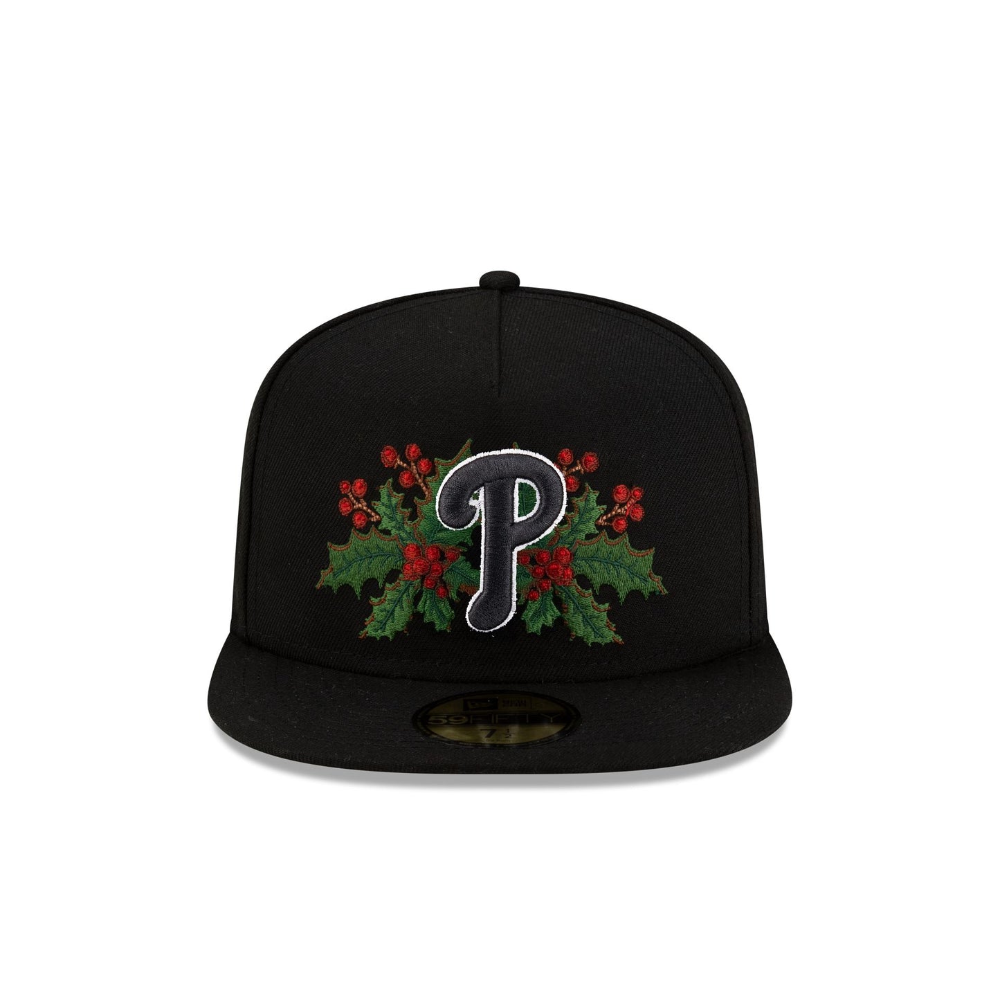 The Philadelphia Phillies Holly 59FIFTY A-Frame Fitted Cap features an embroidered Phillies black and white logo with holly at the front panels with a matching MLB Batterman logo at the rear. Additional details include a holly New Era Flag at the left-wear side and a black undervisor.