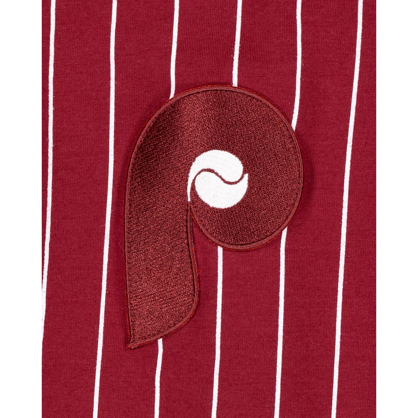 The Philadelphia Phillies Logo Select Pinstripe Hoodie features a chenille applique Phillies logo at the left chest with team patches at each sleeve and an embroidered team wordmark at the rear.