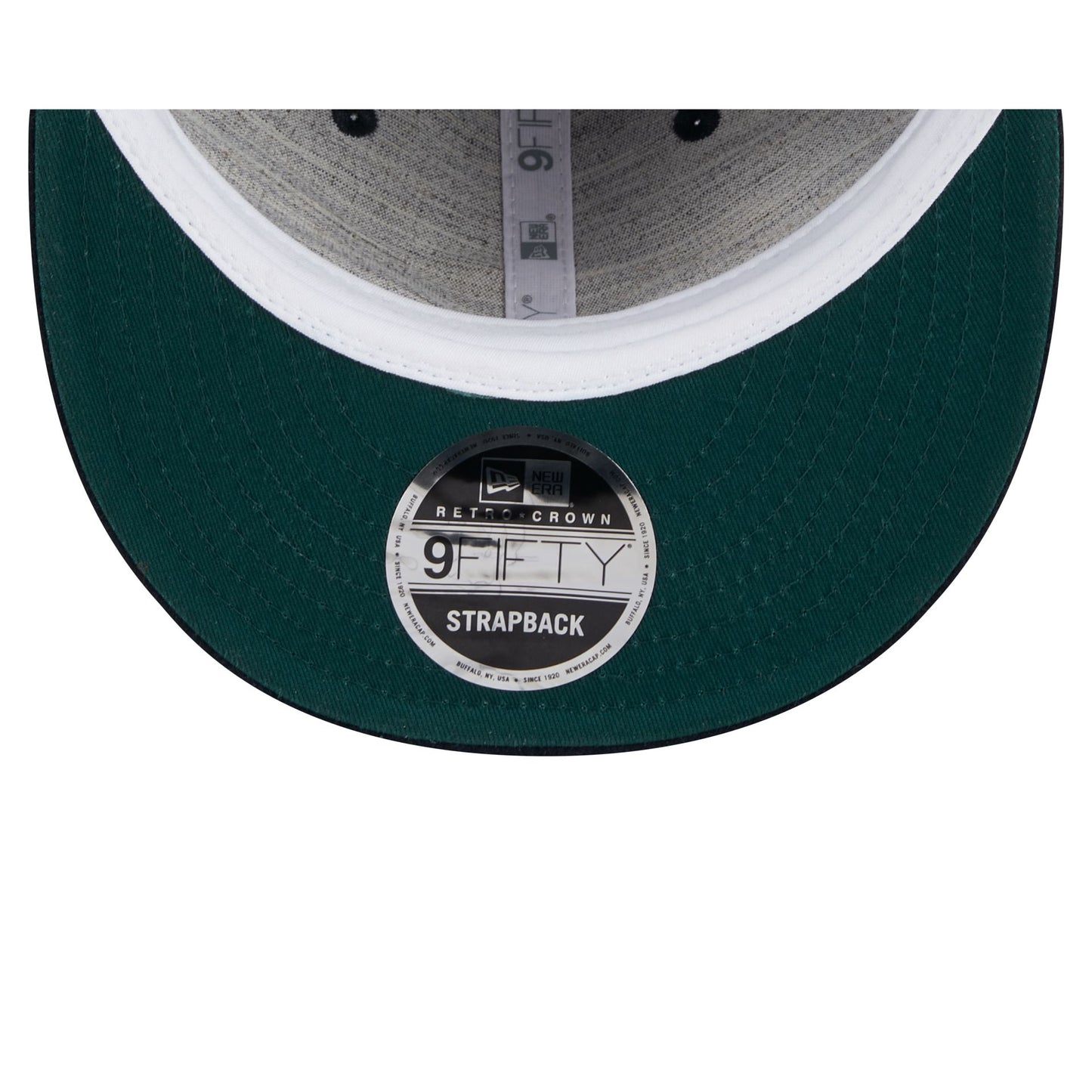 The Philadelphia Phillies Melton Wool Retro Crown 9FIFTY Strapback Cap features a relaxed crown with an embroidered Phillies Cooperstown wordmark at the front panels, a green undervisor, and an adjustable leather strap at the rear.