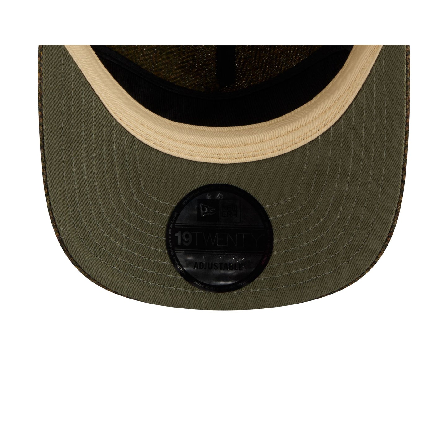 The Philadelphia Phillies Olive Merino Lambswool Moon 19TWENTY Adjustable Cap features an embroidered Phillies Cooperstown logo at the front panels with a Merino Lambswool fabrication throughout and a satin Moon tag woven to the right-wear side. Additional details include an adjustable metal clasp closure at the rear and a dark olive green undervisor.