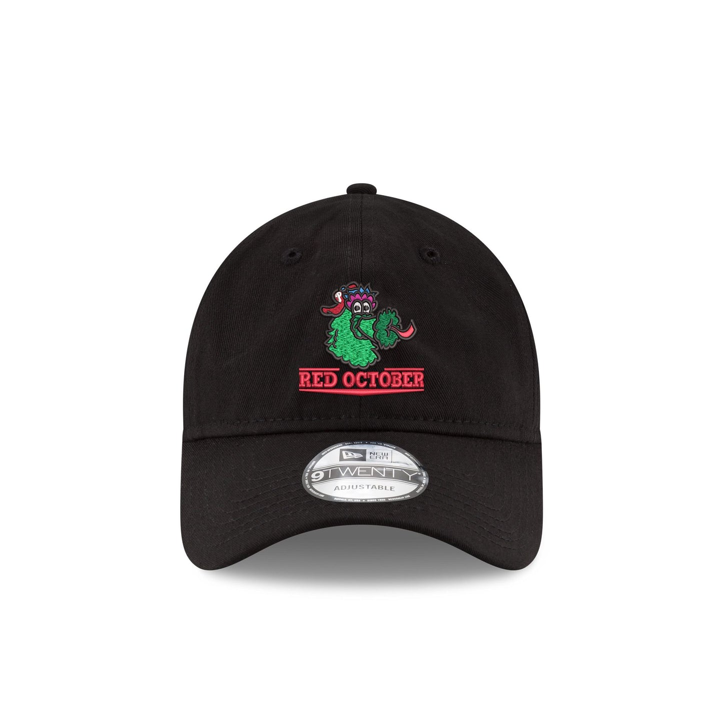 The Philadelphia Phillies Red October Black 9TWENTY Adjustable Cap features an embroidered Phillie Phanatic mascot with a Red October wordmark at the front panels and an adjustable D-Ring closure at the rear.