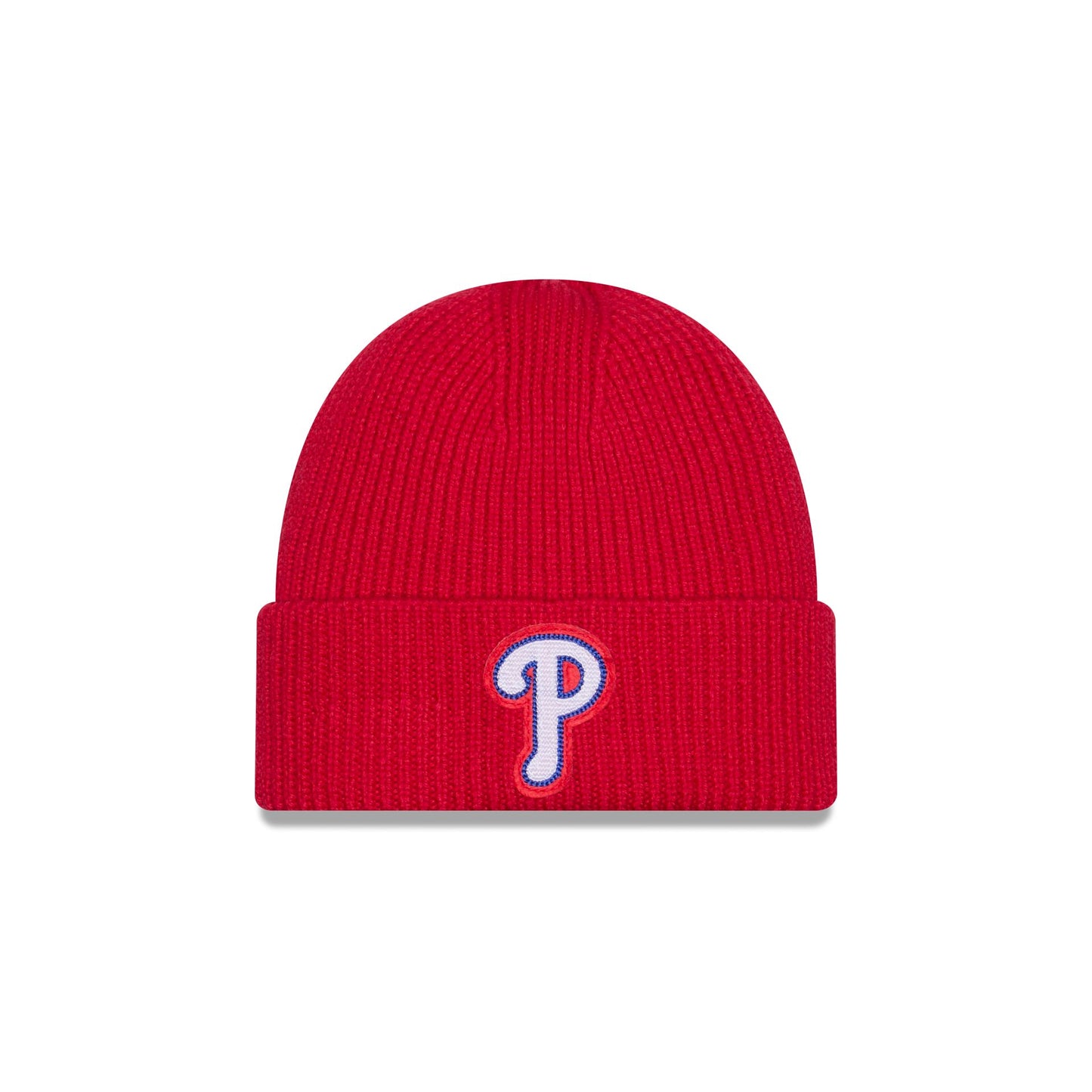 The Philadelphia Phillies Short Skull Cuff Knit Beanie features an embroidered Phillies logo at the front cuff with the MLB Batterman logo at the rear.