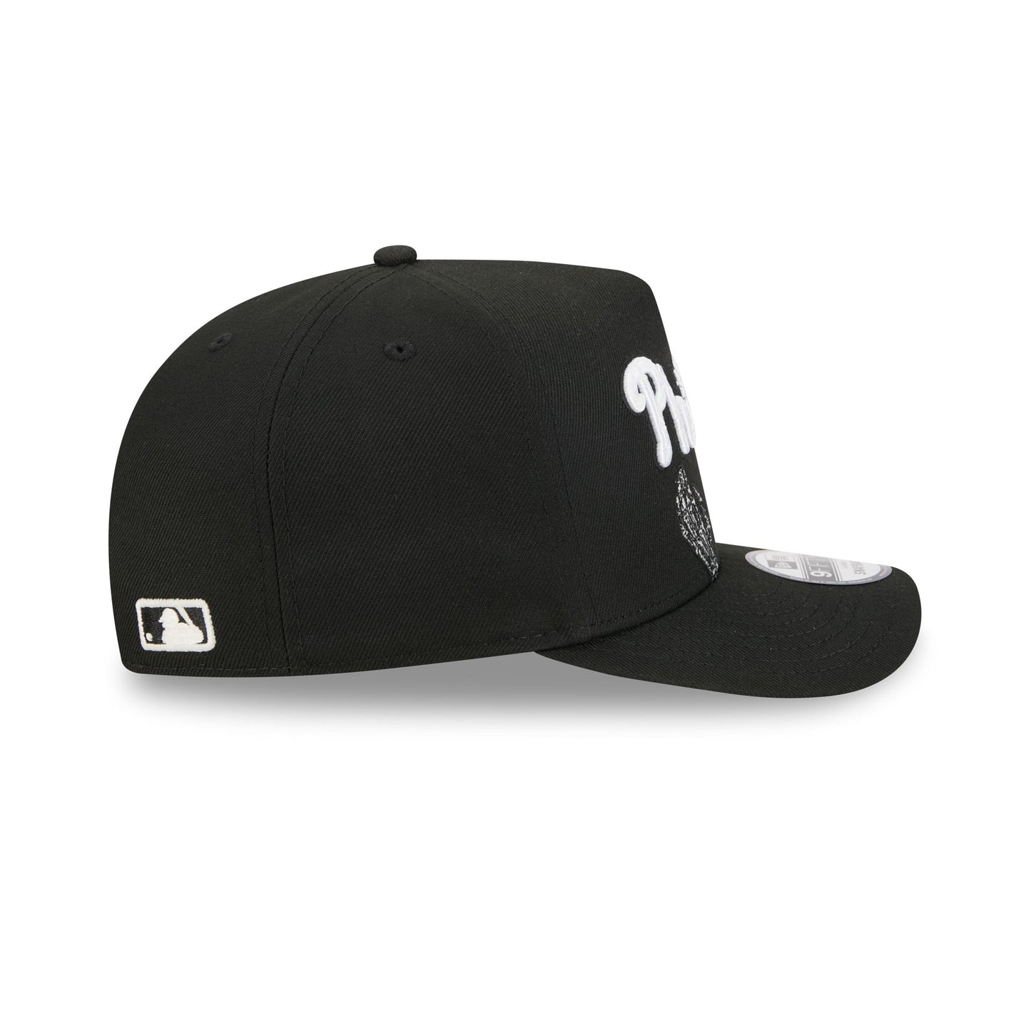 The Philadelphia Phillies Skeletal Script 9FIFTY A-Frame Snapback features a glow-in-the-dark embroidered Phillies wordmark and skeleton hands at the front with an MLB Batterman logo at the right of a snapback closure at the rear and a gray undervisor.