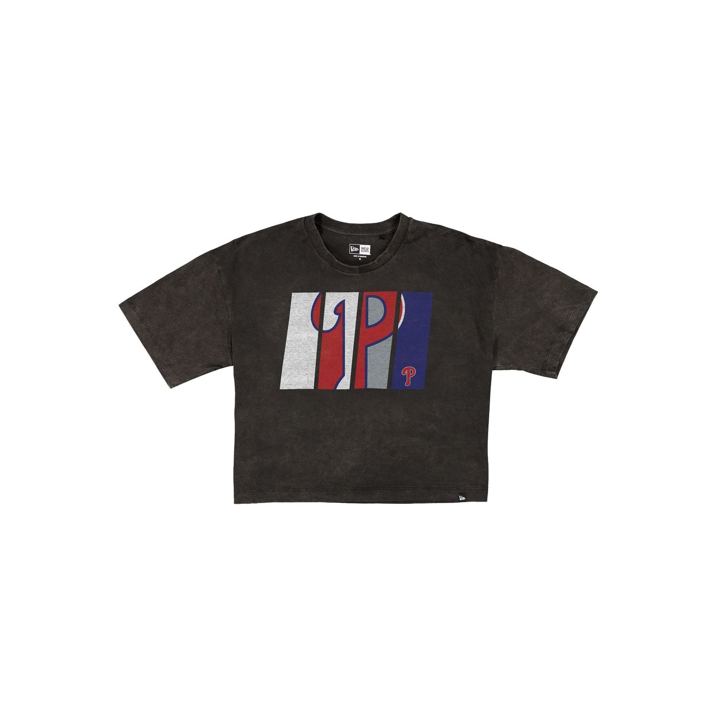 The Philadelphia Phillies Sport Night Black Cropped Women's T-Shirt features a screen-printed Phillies graphic at the front with a cropped cut.