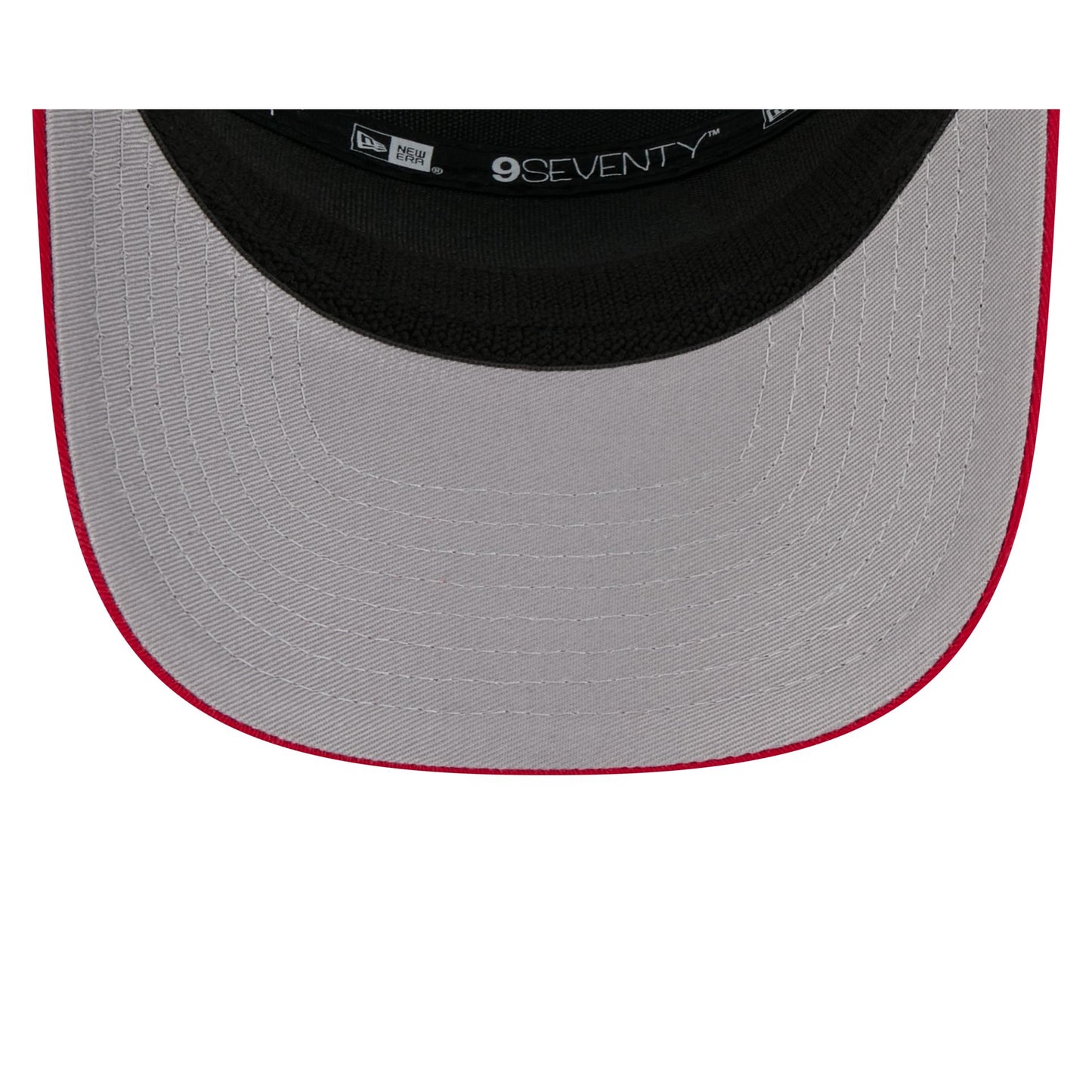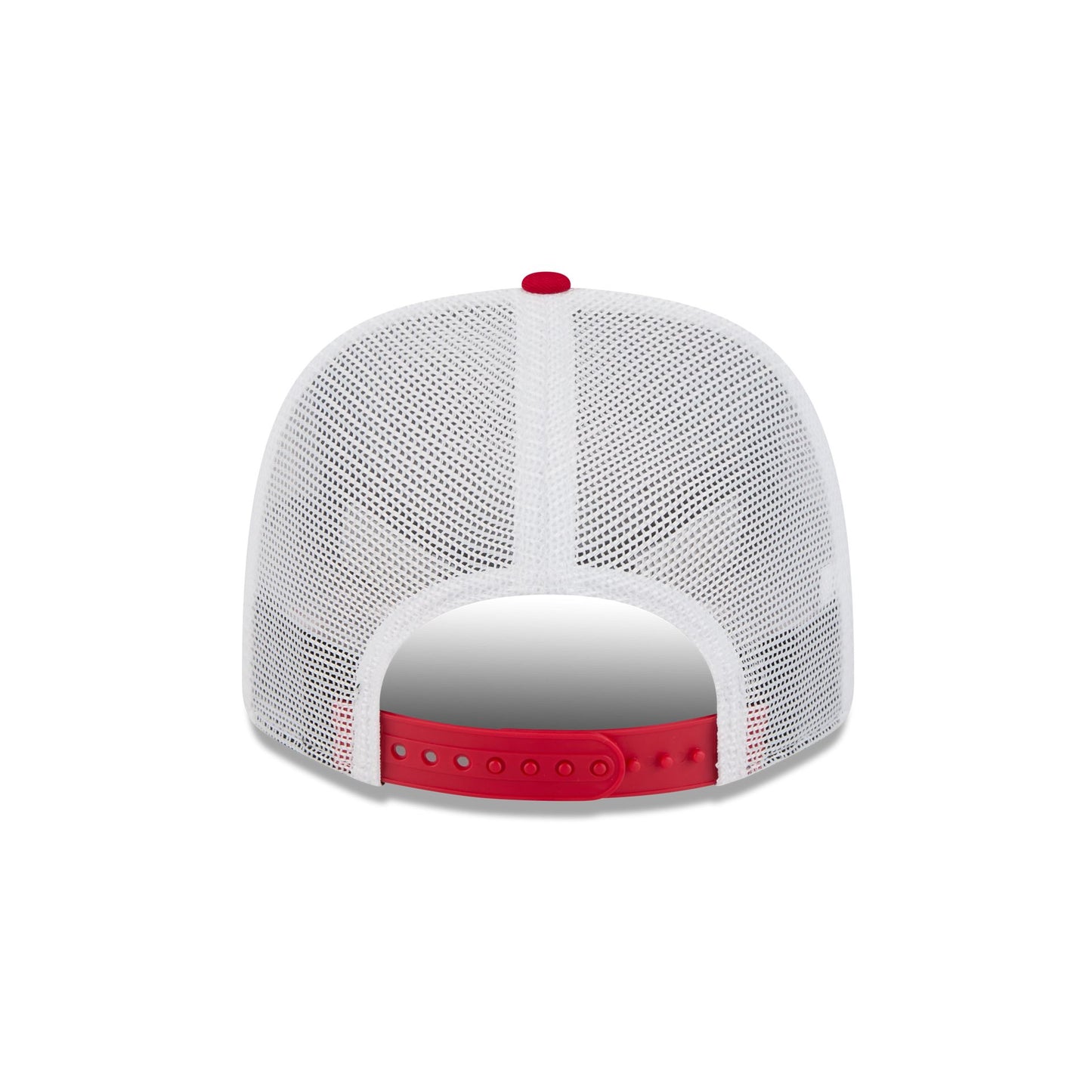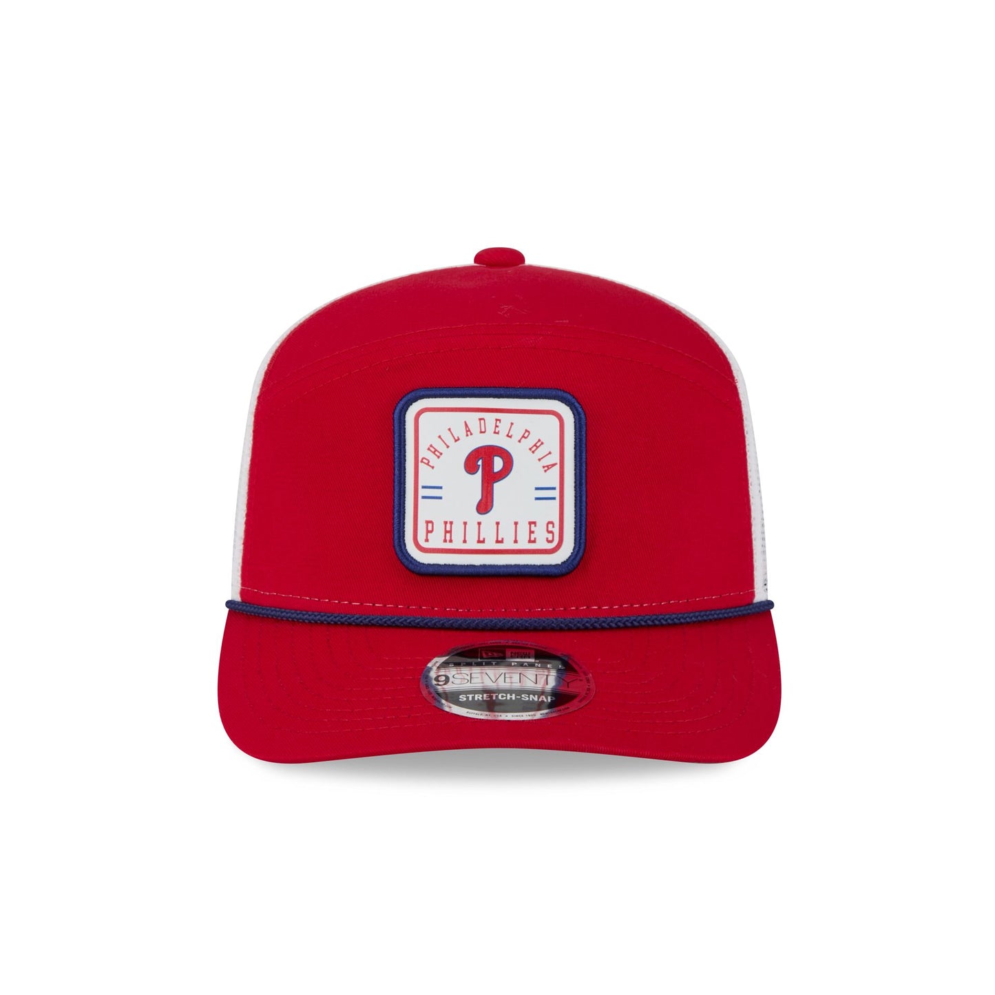 The Philadelphia Phillies Square Patch Split Panel 9SEVENTY Trucker features an embroidered Phillies square patch at the front panel with a split crown construction and a rope at the visor. Additional details include an adjustable stretch-snap closure at a mesh rear and a gray undervisor.