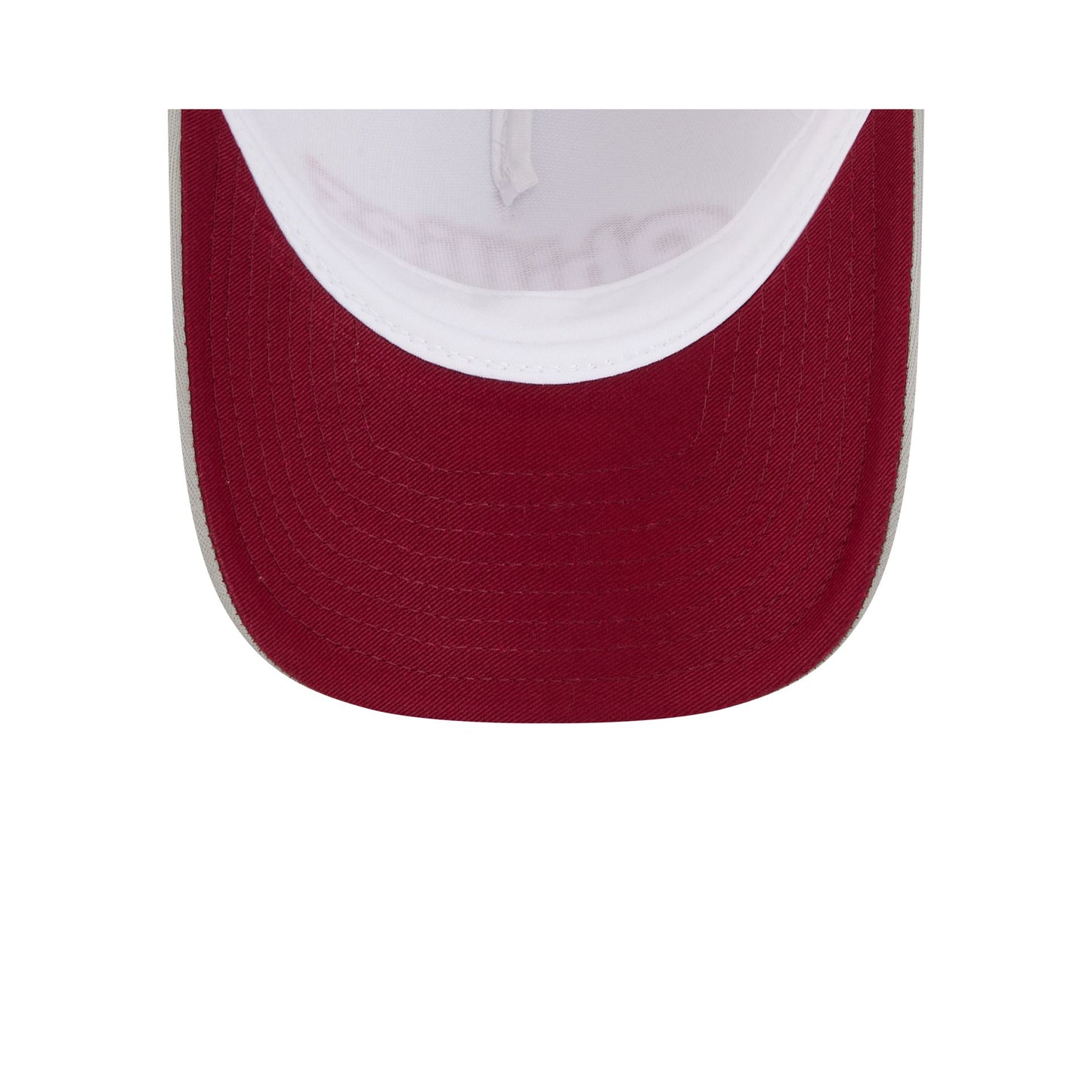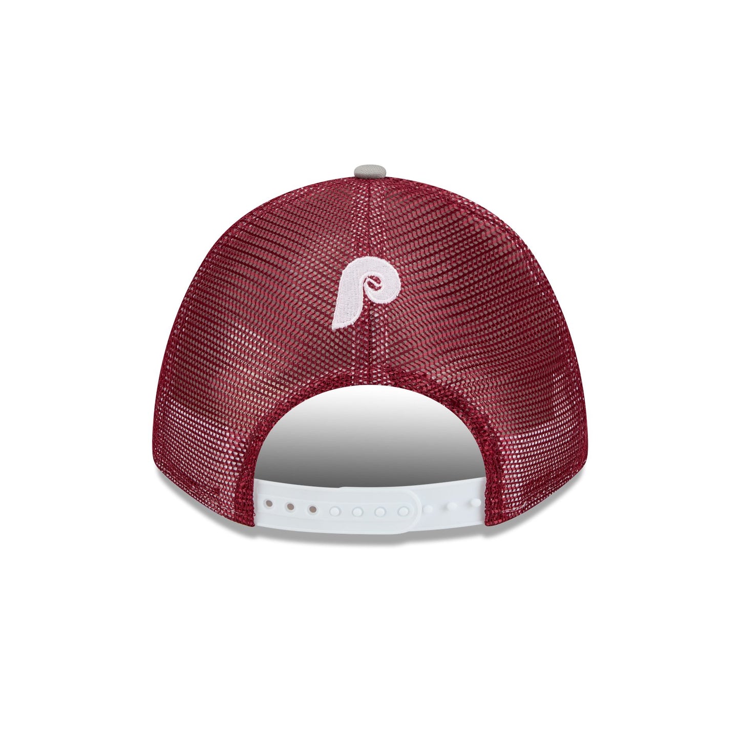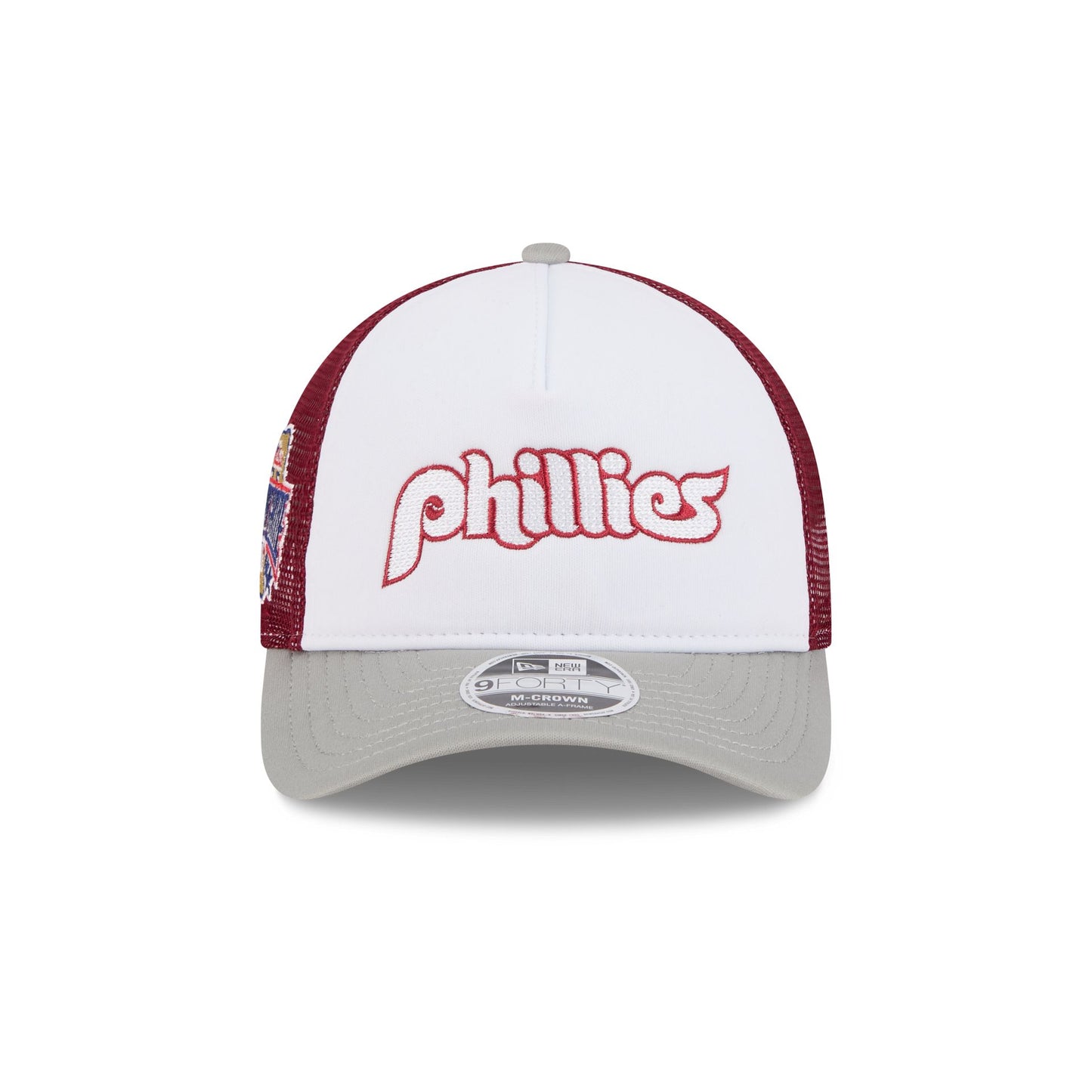 The Philadelphia Phillies Summer Derby 9FORTY M-Crown A-Frame Snapback features an embroidered Phillies Cooperstown wordmark at the front panel with a 1996 All-Star Game patch at the right-wear side. Additional details include a team logo above an adjustable snapback closure at the rear with a gray visor and a red undervisor.