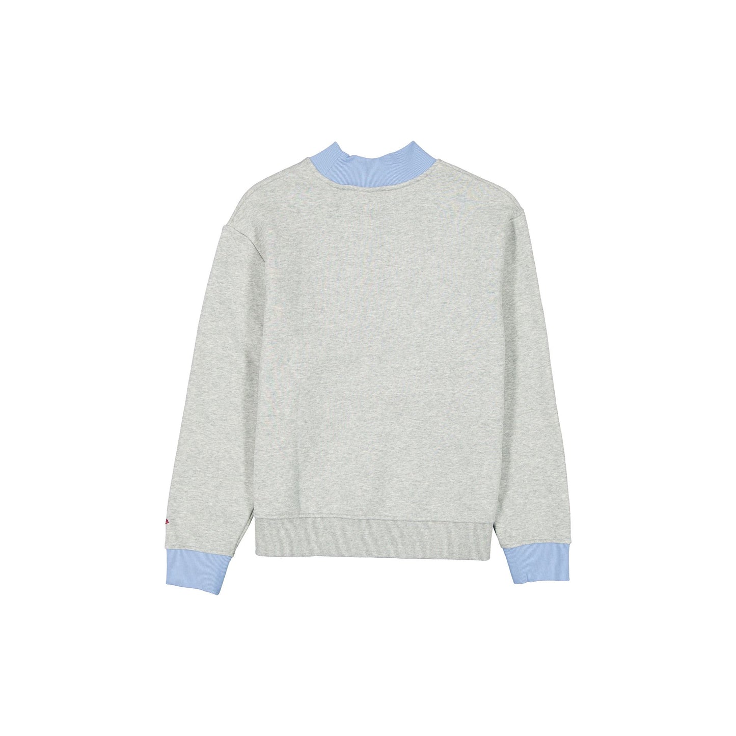 The Philadelphia Phillies Throwback Prep Women's Mockneck Sweatshirt features an embroidered Phillies wordmark above a team emblem at the front with a matching logo at the neckline.