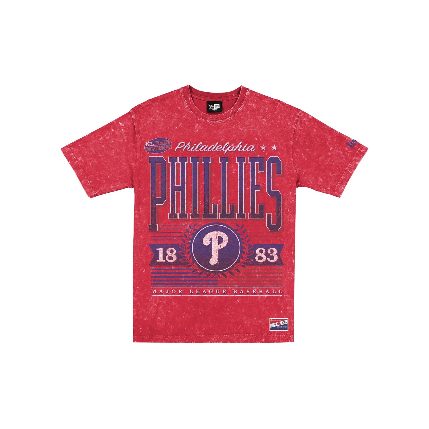 The Philadelphia Phillies Throwback Vintage Wash T-Shirt features a screen-printed Phillies graphic at the front with a mineral wash fabrication throughout and a woven New Era jock tag at the left hip.