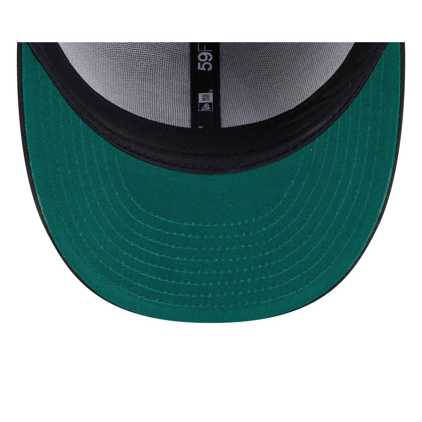 The Philadelphia Phillies Tonal Florals Black Pre-Curved 59FIFTY Fitted Cap features an embroidered Phillies logo at the front panels with a team color visor and a green undervisor. Additional details include chainstitched embroidered flowers with handstitched beading at the left-wear side and a matching MLB Batterman logo at the rear.