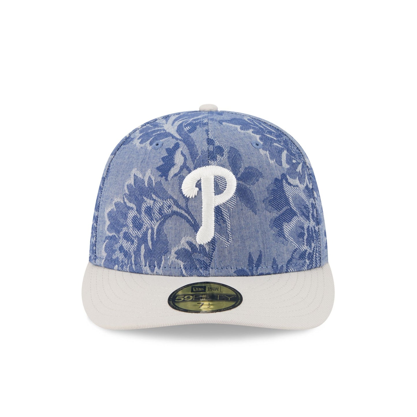 The Philadelphia Phillies Two-Tone Denim 59FIFTY Fitted Cap features an embroidered Phillies logo at the front panels against a specialty Japanese milled gobline chambray fabrication from Three Looms Japan Fabrics throughout the cap. Additional details include an MLB Batterman logo at the rear and a gray undervisor.
