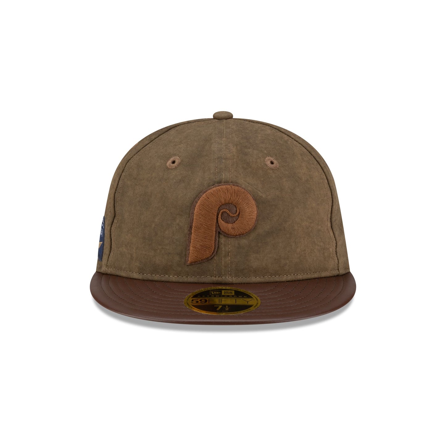 The Philadelphia Phillies Utility Linen Retro Crown 59FIFTY Fitted Cap features an embroidered Phillies logo at the front panels with a team patch at the right-wear side. Additional details include a faux leather visor and the MLB Batterman logo at the rear.