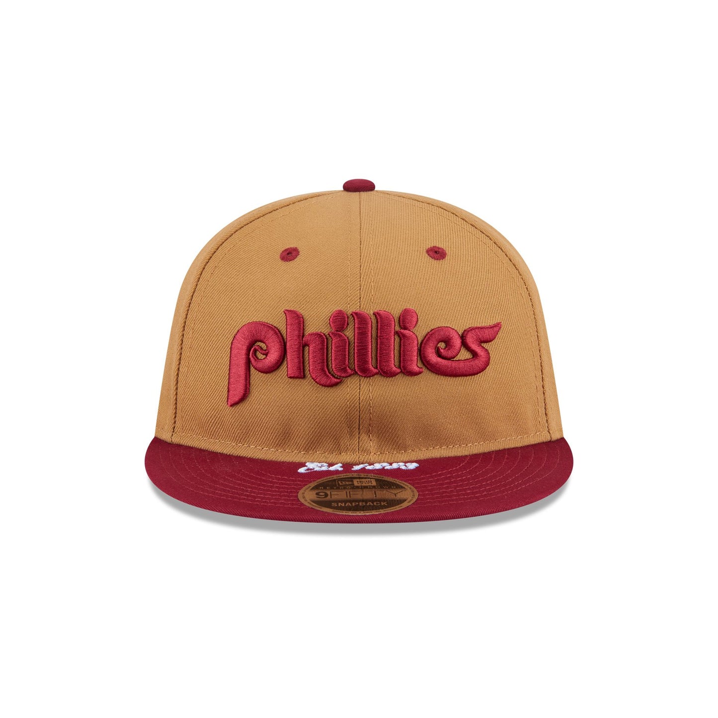 The Philadelphia Phillies Wheat Retro Crown 9FIFTY Snapback features an embroidered Phillies Cooperstown logo at the front panels with an established date at the visor. Additional details include a snapback closure at the rear and a green undervisor.