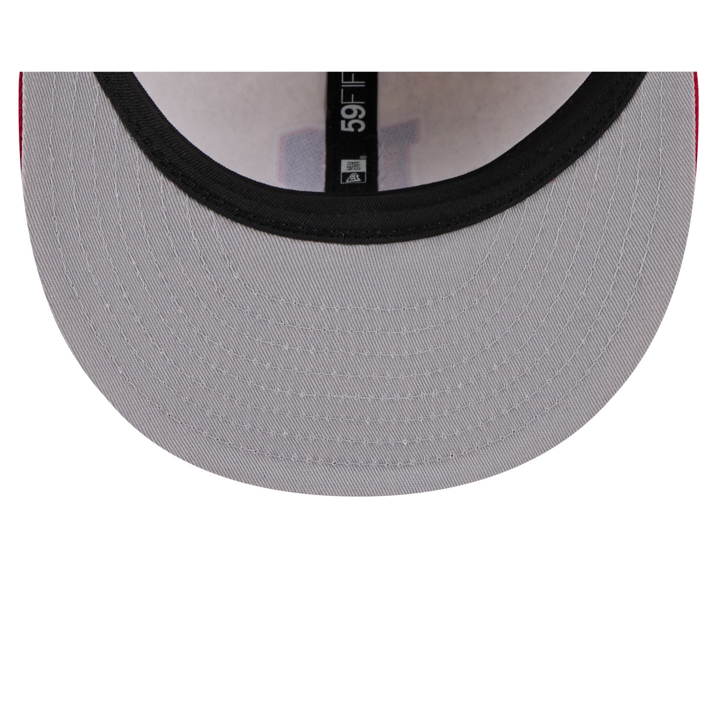 The Philadelphia Phillies Wool Letterman Retro Crown 59FIFTY Fitted Cap features an embroidered loop Phillies logo at the front panels and an additional logo at the rear. Additional details include a wool fabrication throughout the cap and a gray undervisor.