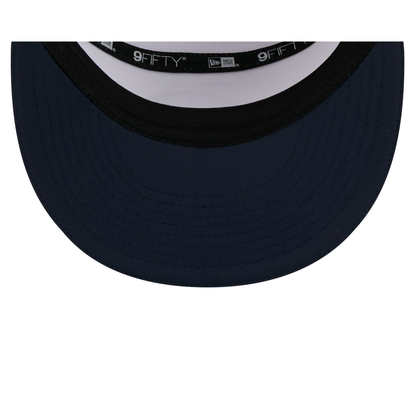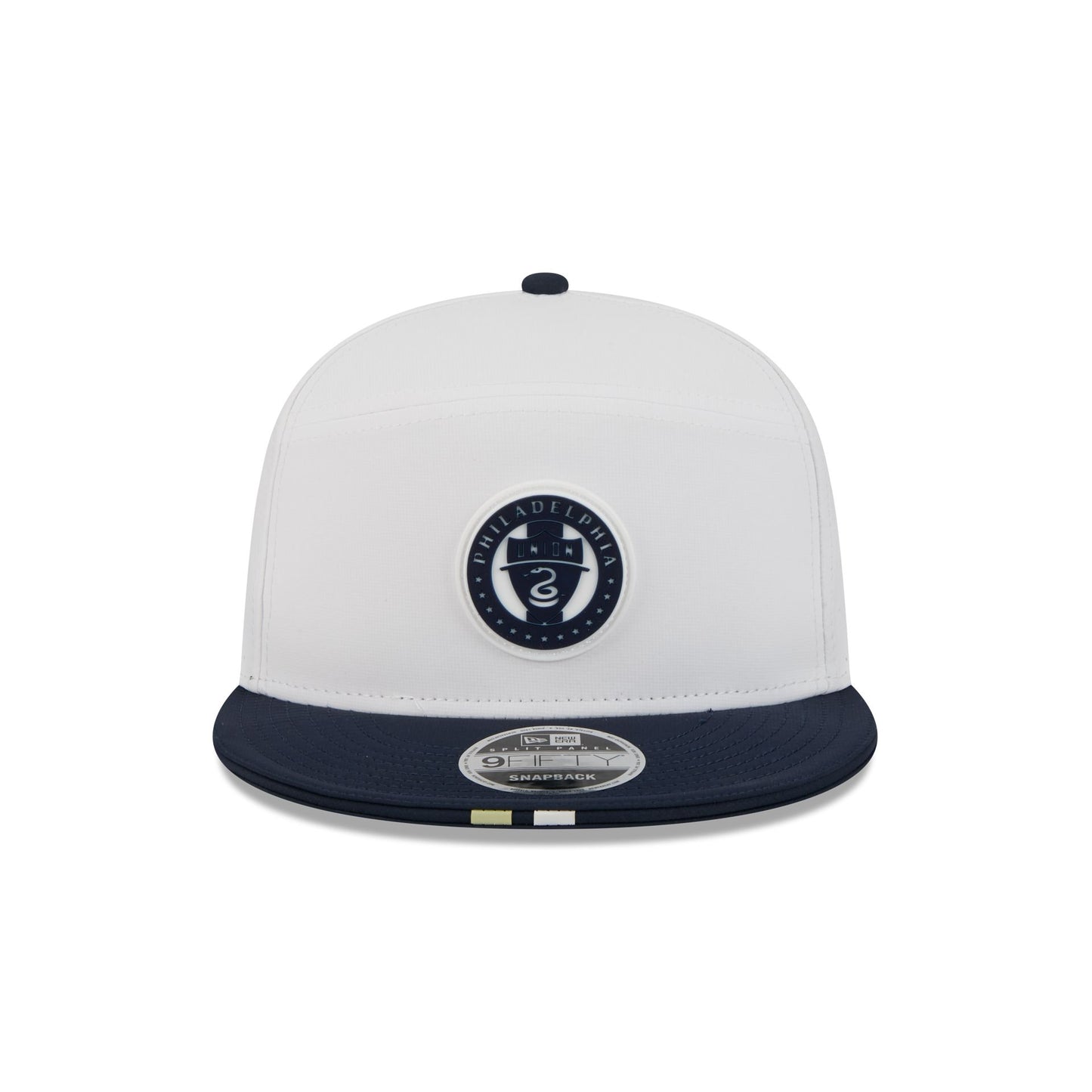 The Philadelphia Union 2026 MLS Kickoff Split Panel 9FIFTY Snapback features a stitch-down silicone Union logo patch at the front panel with a matching woven MLS Shield tag above a snapback closure at the rear. Additional details include a quill tech performance fabrication with a navy visor accented with team color stripes at the front.