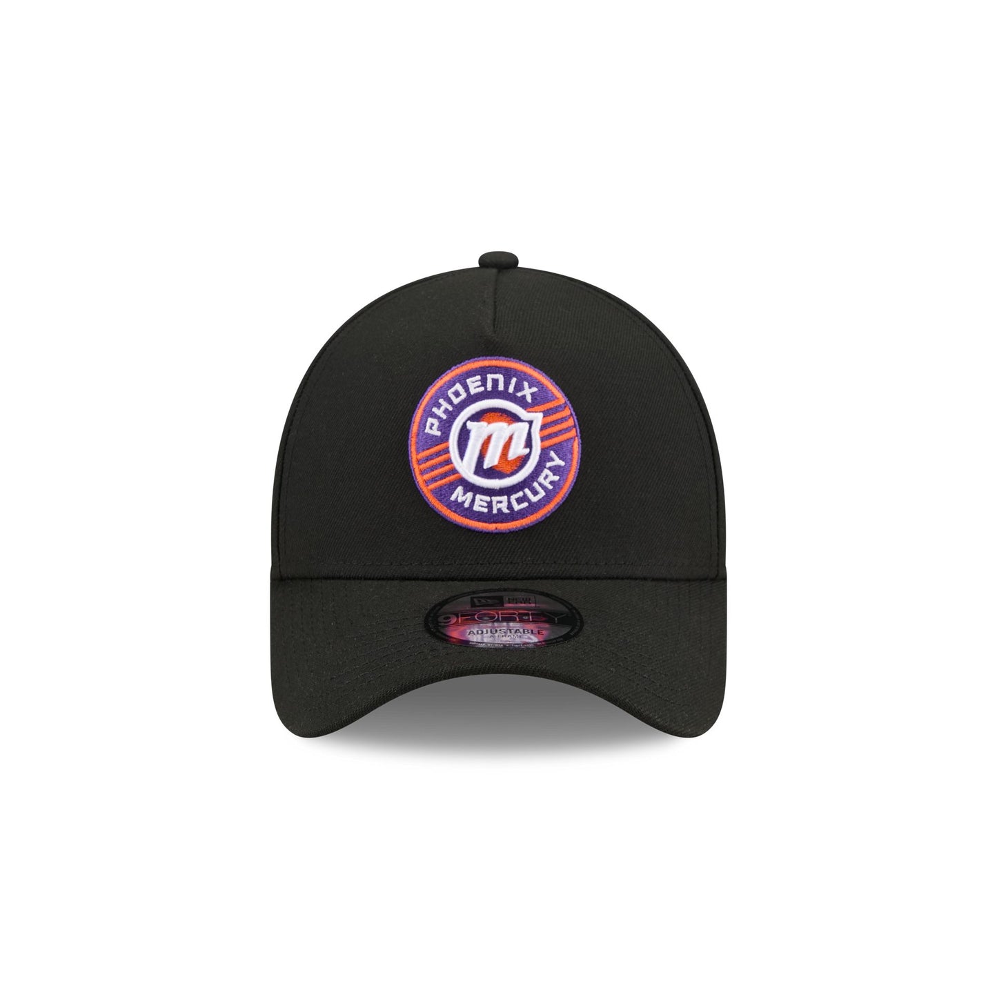 The Phoenix Mercury Black 9FORTY A-Frame Snapback features an embroidered Mercury circle logo at the front panels with an adjustable snapback closure at the rear.