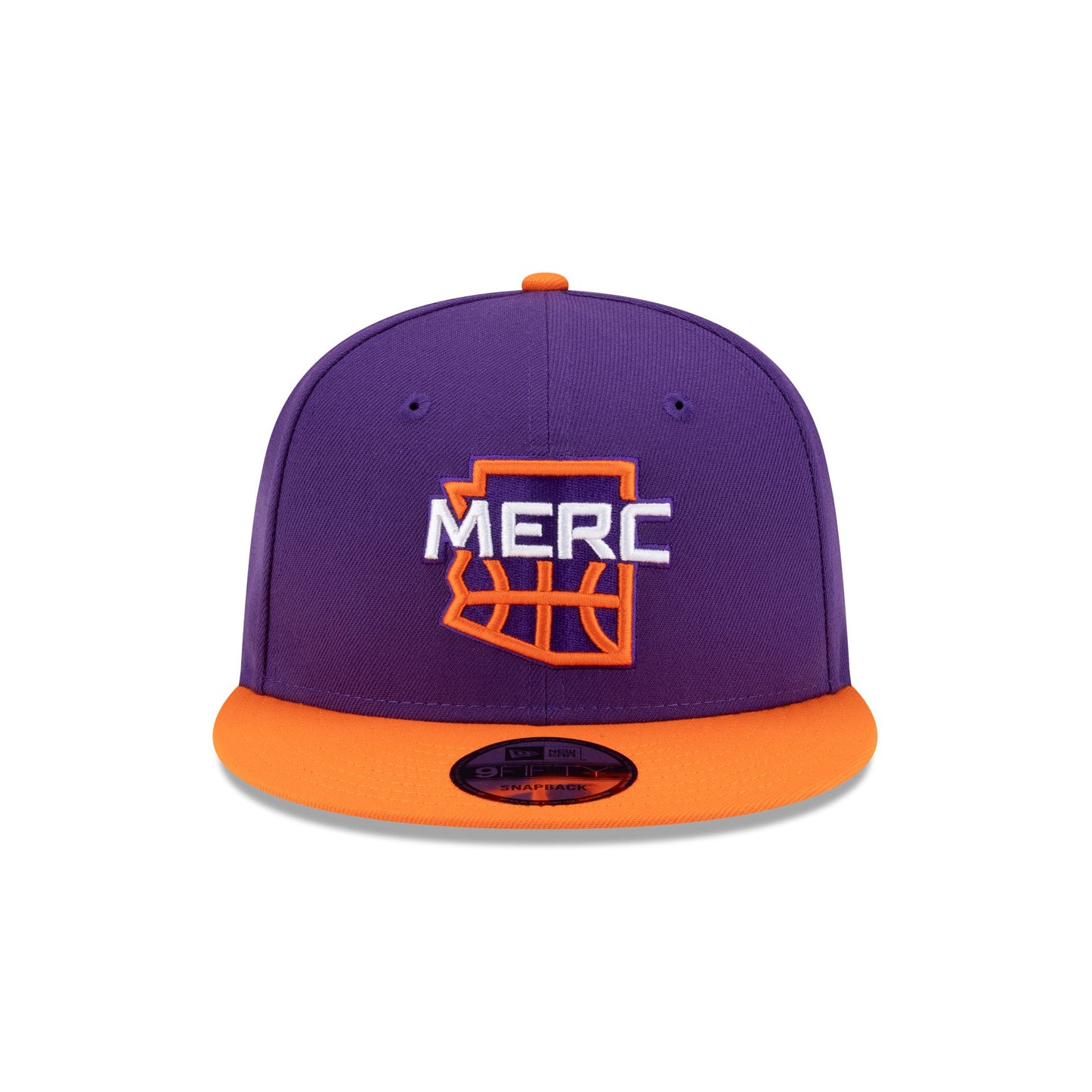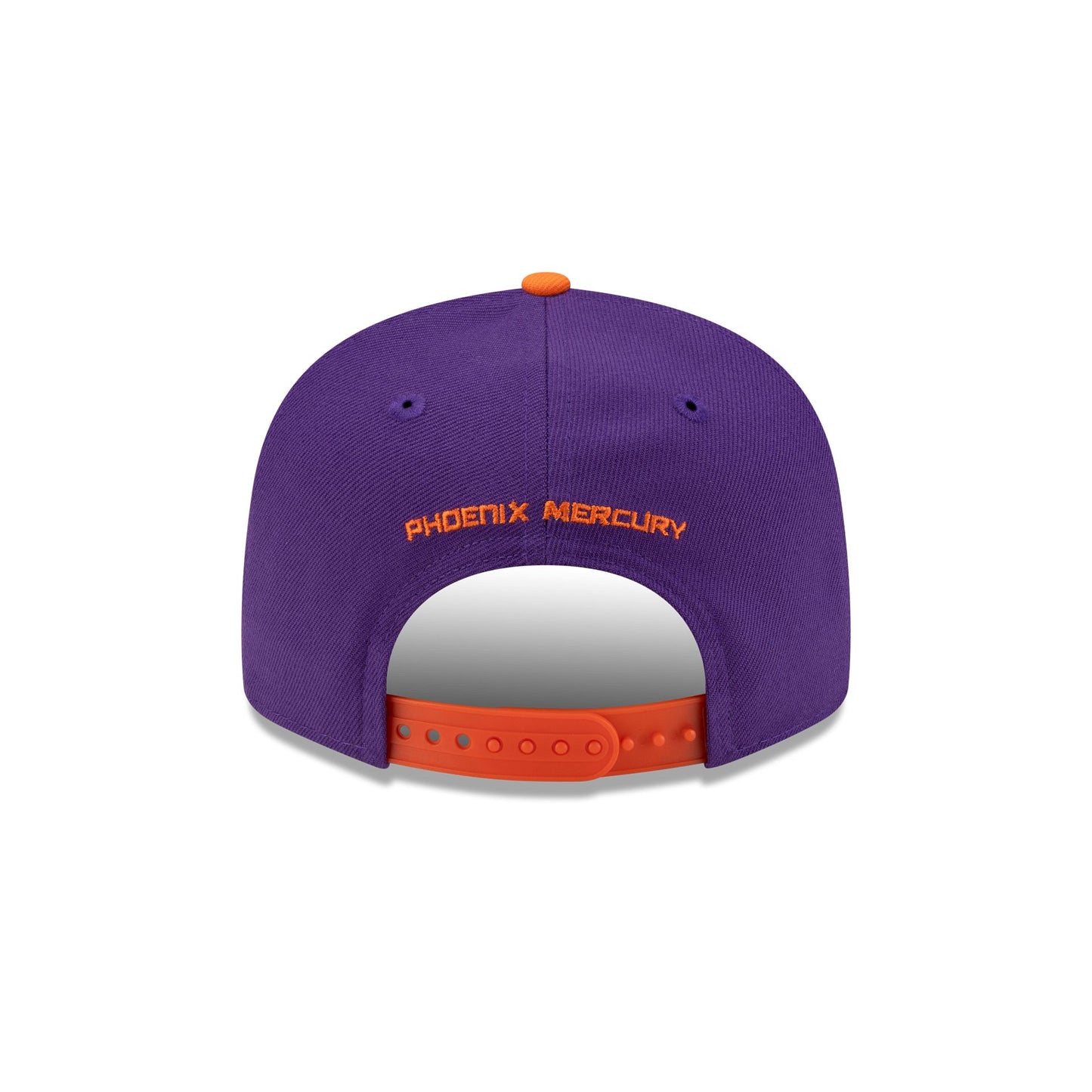The Phoenix Mercury True Purple 9FIFTY Snapback features an embroidered Mercury logo at the front panels with a wordmark above and adjustable snapback closure at the rear and a gray undervisor.