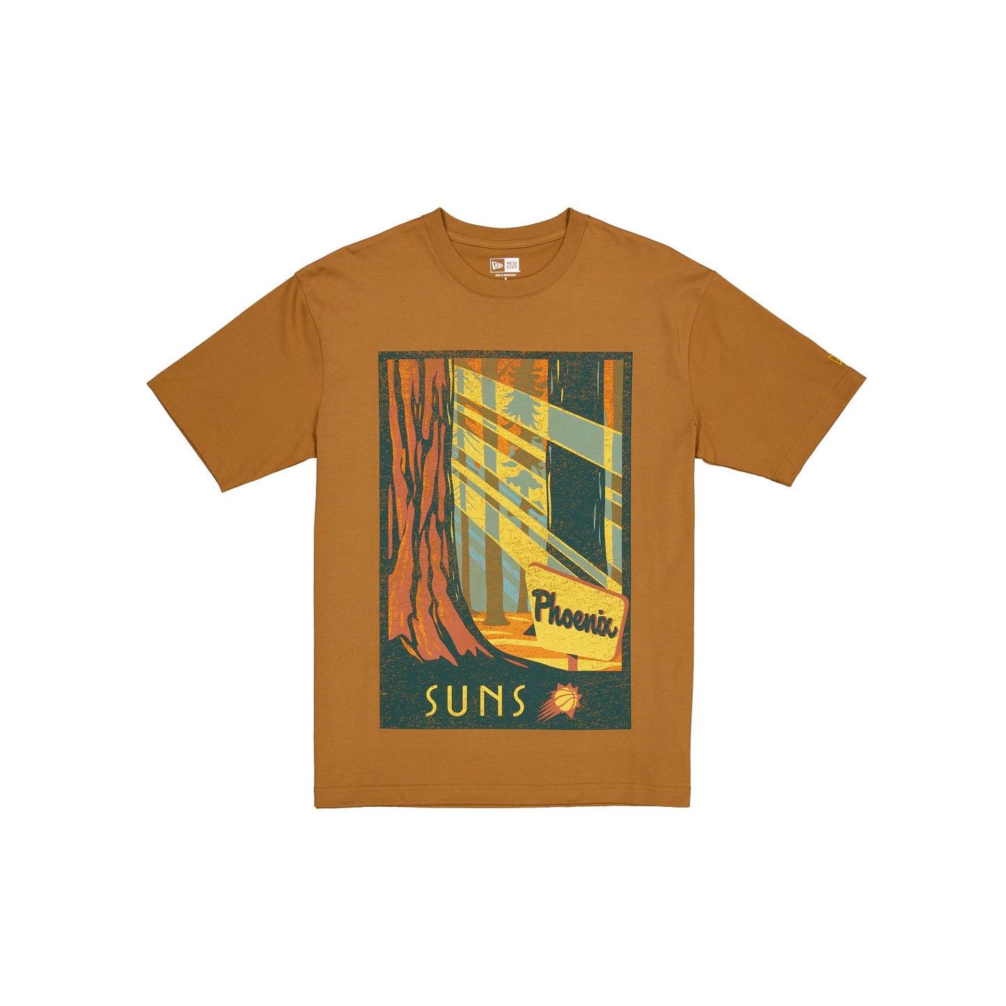 The Phoenix Suns 2025 All-Star Game Victory Grove Light Bronze T-Shirt features a screen-printed Suns forest graphic at the front.
