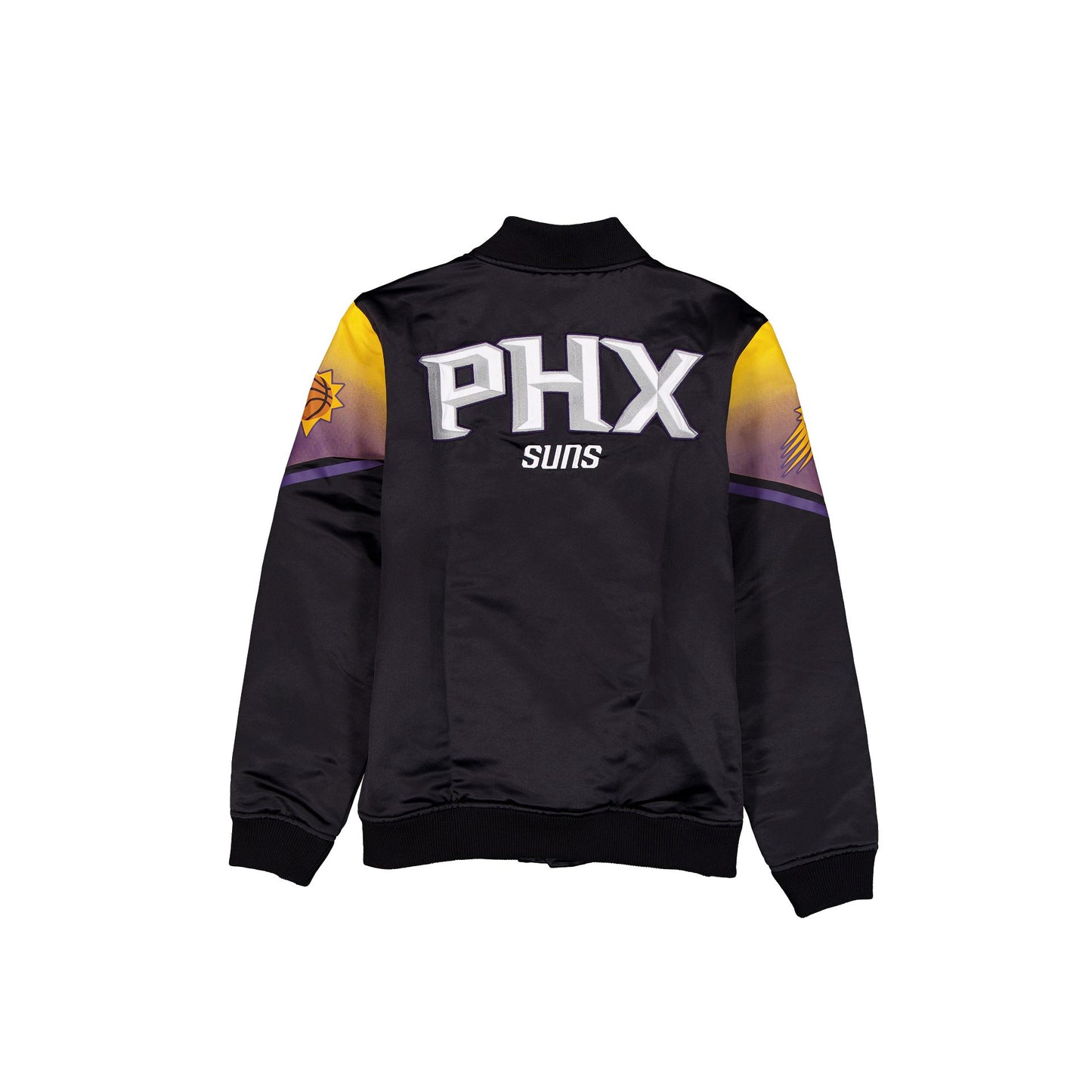The Phoenix Suns 2025 City Edition Black Jacket features an embroidered Suns City Edition wordmark at the front with an embroidered script arena address and woven City Edition jock tag at the left hip. Additional details include an applique graphic at the rear, a satin fabrication throughout, and a snap-button closure with front pockets.