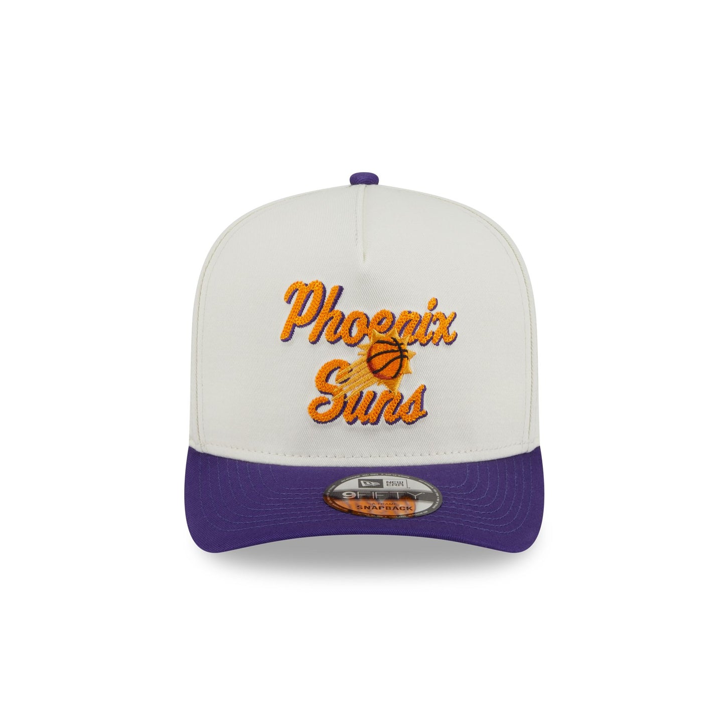 The Phoenix Suns Chainstitch 9FIFTY A-Frame Snapback features a chainstitch Suns logo and script wordmark at the front panels with a snapback closure at the rear and a gray undervisor.