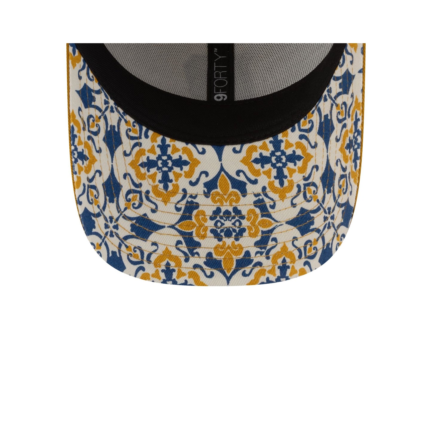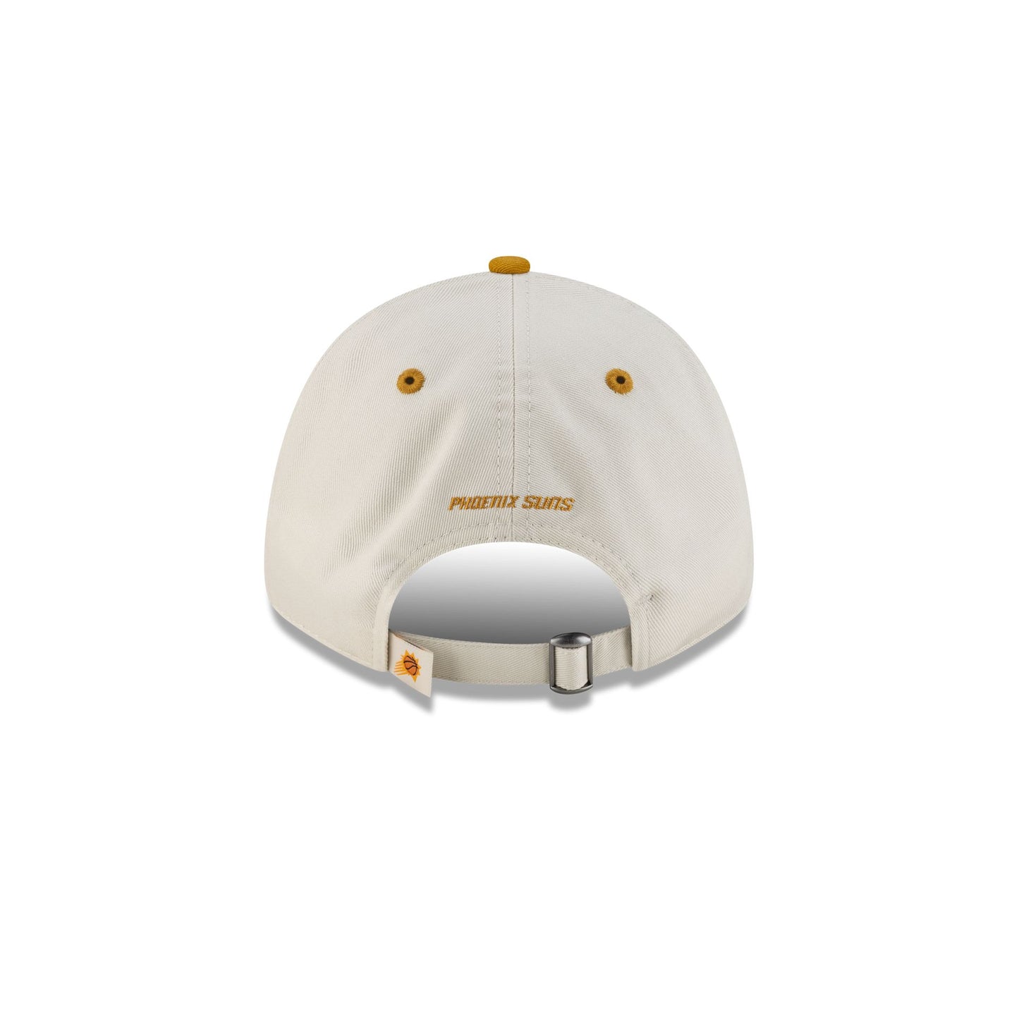 The Phoenix Suns China Games Ivory 9FORTY Adjustable Cap features an embroidered Suns floral logo at the front panels with a graphic at the right-wear side. Additional details include a team wordmark above an adjustable D-Ring closure at the rear and a patterned undervisor.