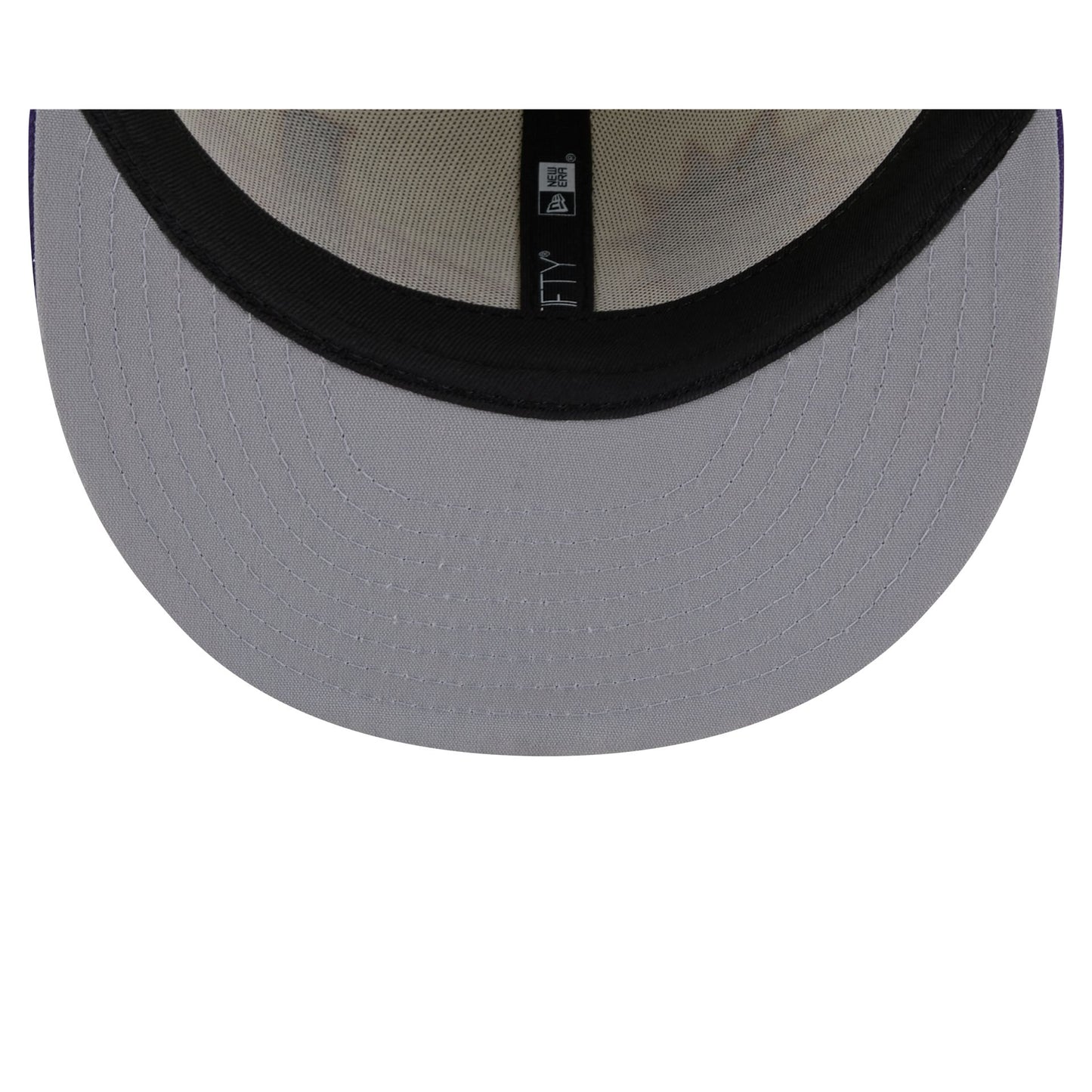The Phoenix Suns Devin Booker Chrome White 59FIFTY Fitted Cap features an embroidered Suns logo at the right panel and the player's signature and number at the right. Additional details include an MLB Batterman logo at the rear and a gray undervisor.