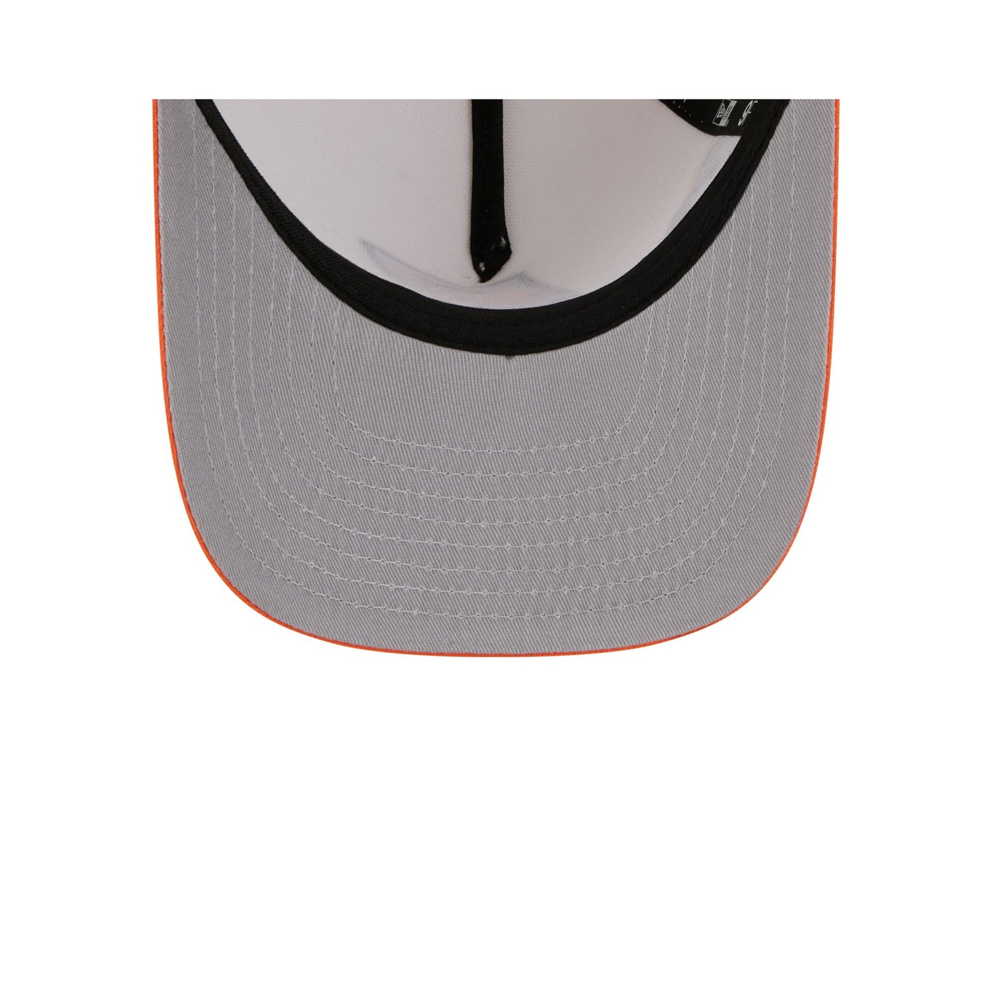 The Phoenix Suns 1968-1991 Hardwood Classics Chrome White 9FIFTY A-Frame Snapback features an embroidered vintage Suns logo at the front panels with a team graphic to the right. Additional details include an adjustable snapback closure at the rear and a gray undervisor.
