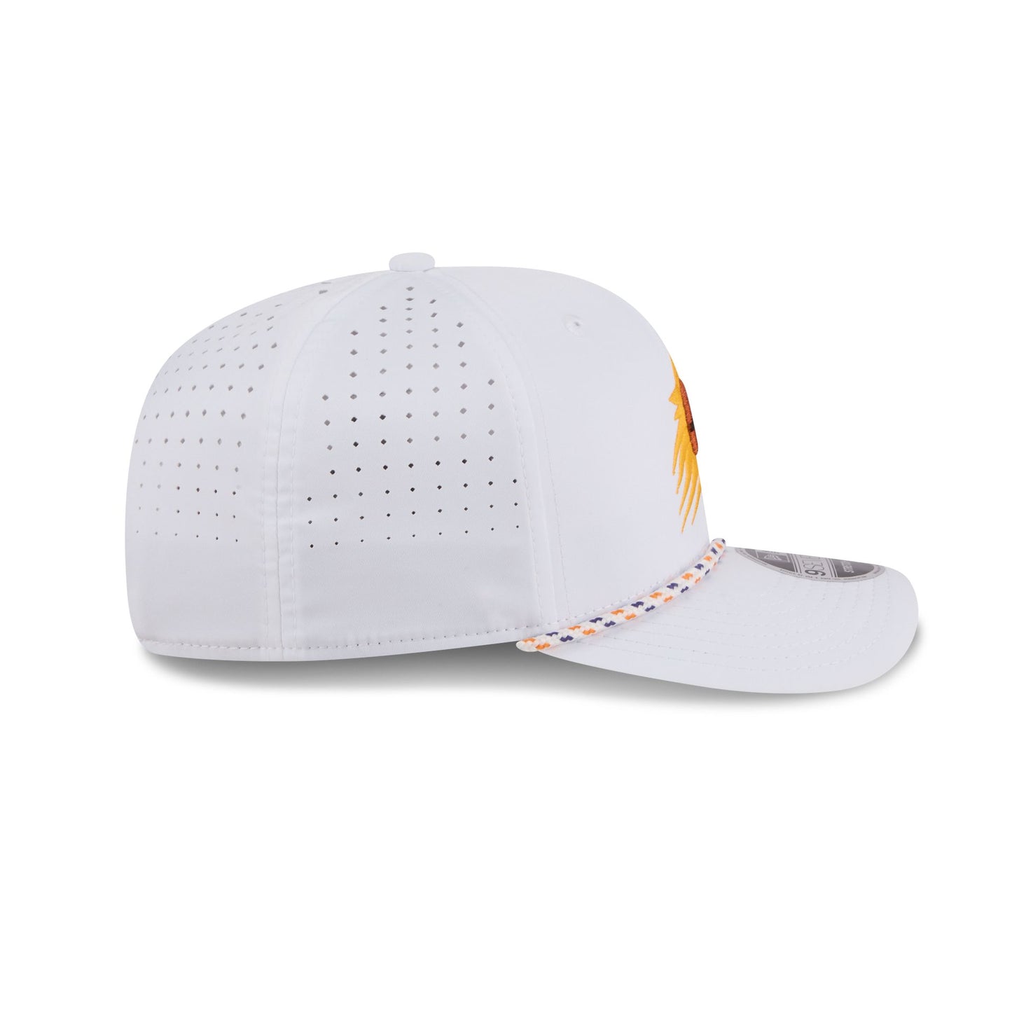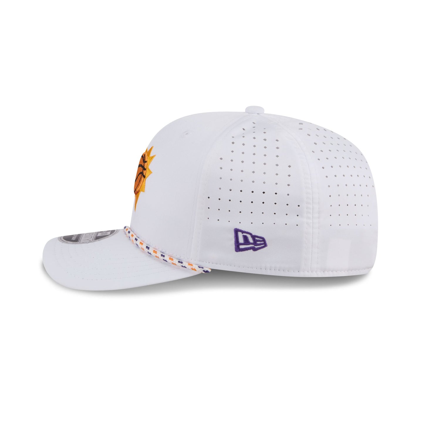 The Phoenix Suns Optic White Performance Rope 9SEVENTY Stretch-Snap features an embroidered Suns logo at the front panels with a performance fabric throughout. Additional details include a rope at the visor, an adjustable stretch-snap closure at a performance mesh rear, and a team color undervisor.