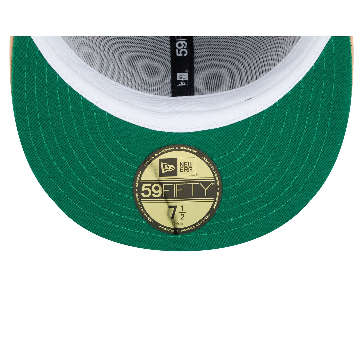 The Pittsburgh Penguins Leather Visor 59FIFTY Fitted Cap features an embroidered Penguins logo at the front panels with a cream leather visor. Additional details include an NHL Shield logo at the rear and a green undervisor with leather accents throughout.