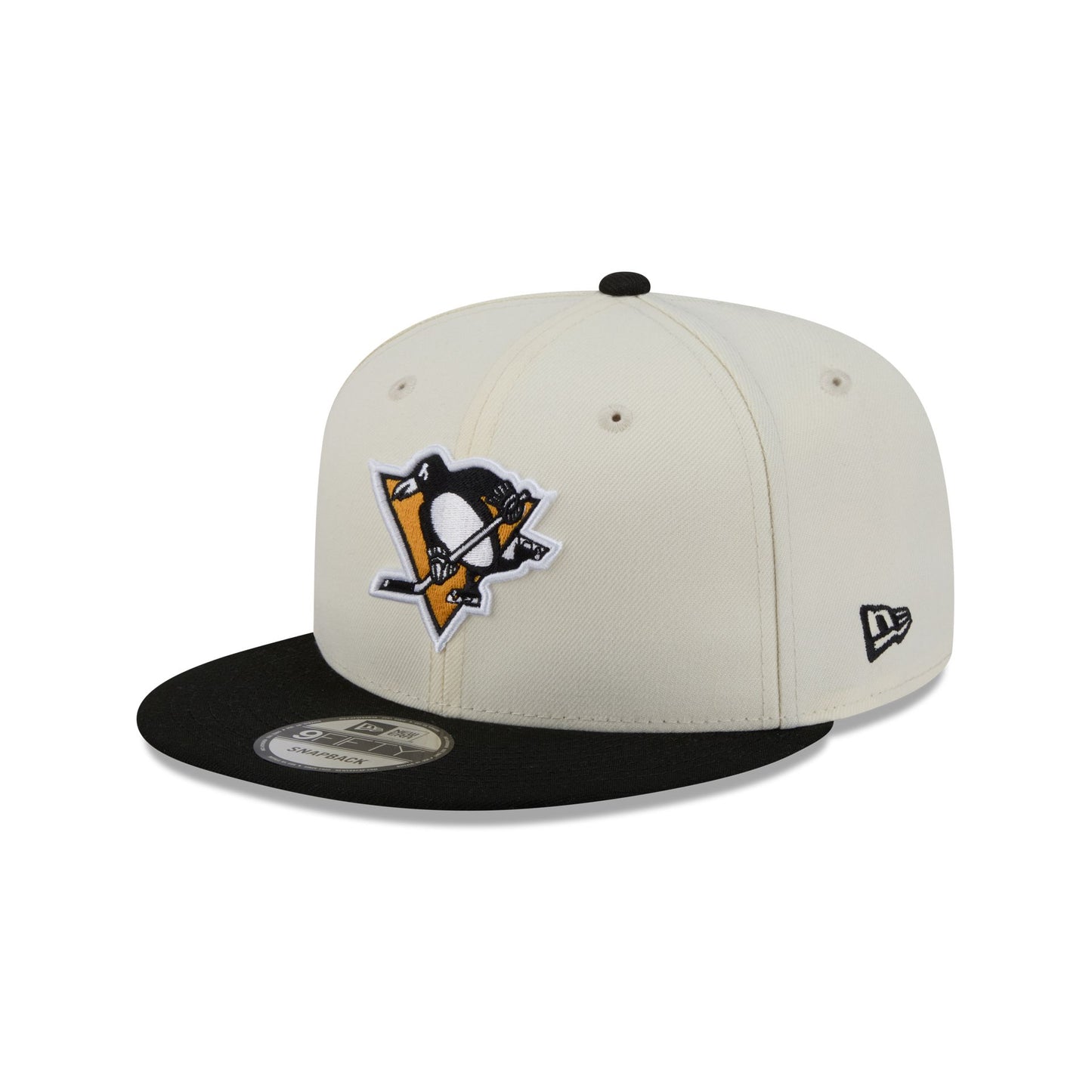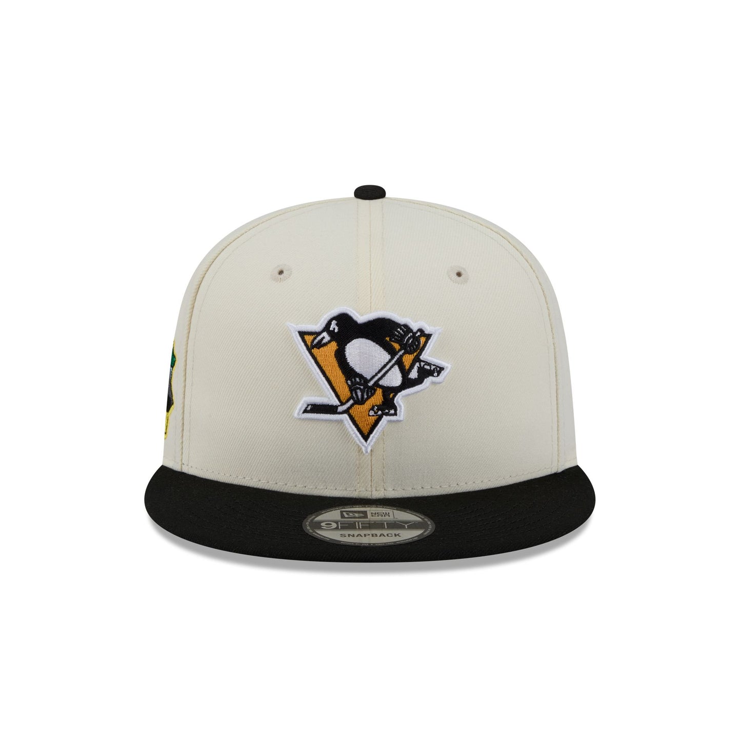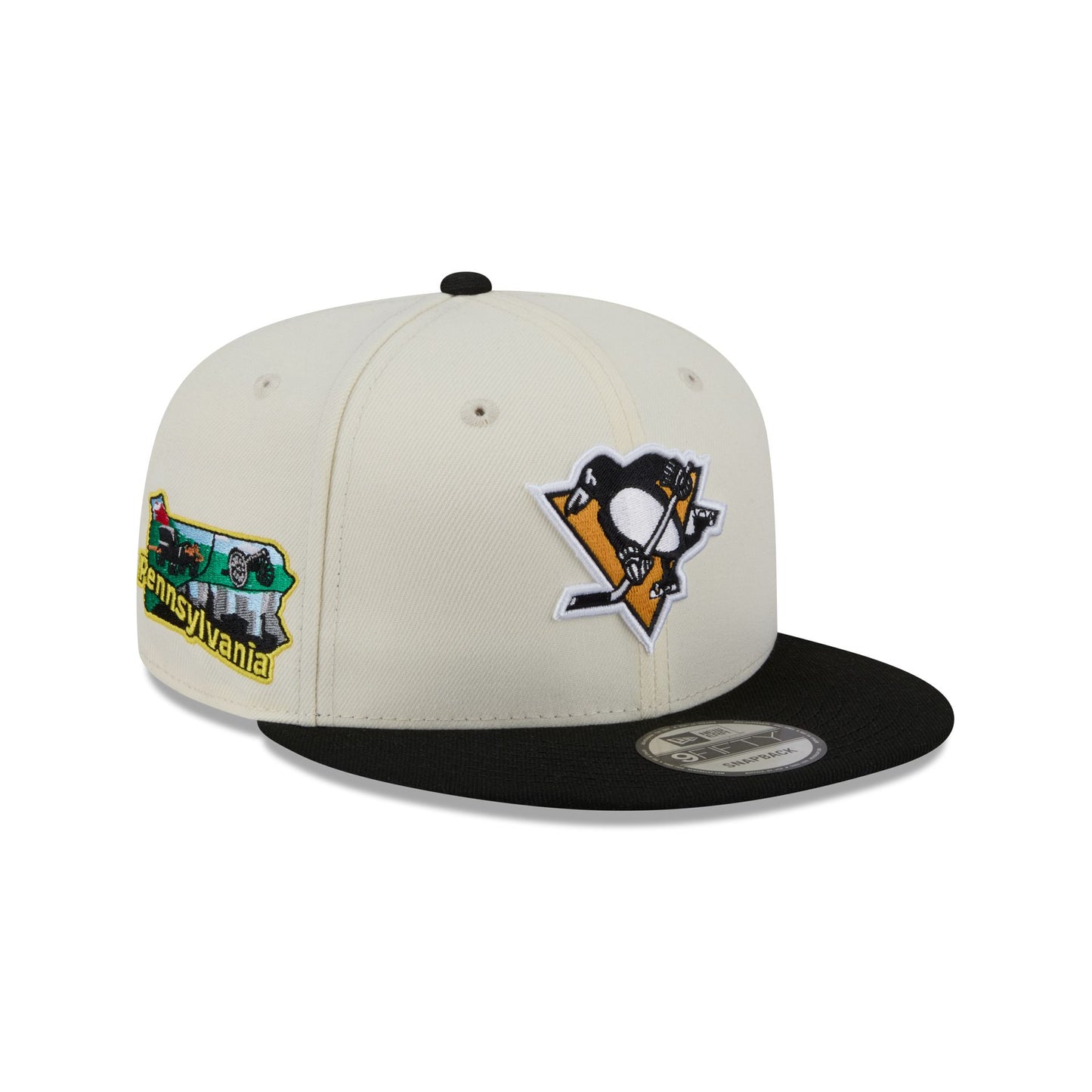 The Pittsburgh Penguins Localized 9FIFTY Snapback features an embroidered Penguins logo at the front panels with a state patch at the right-wear side. Additional details include an adjustable snapback closure at the rear and a green undervisor.