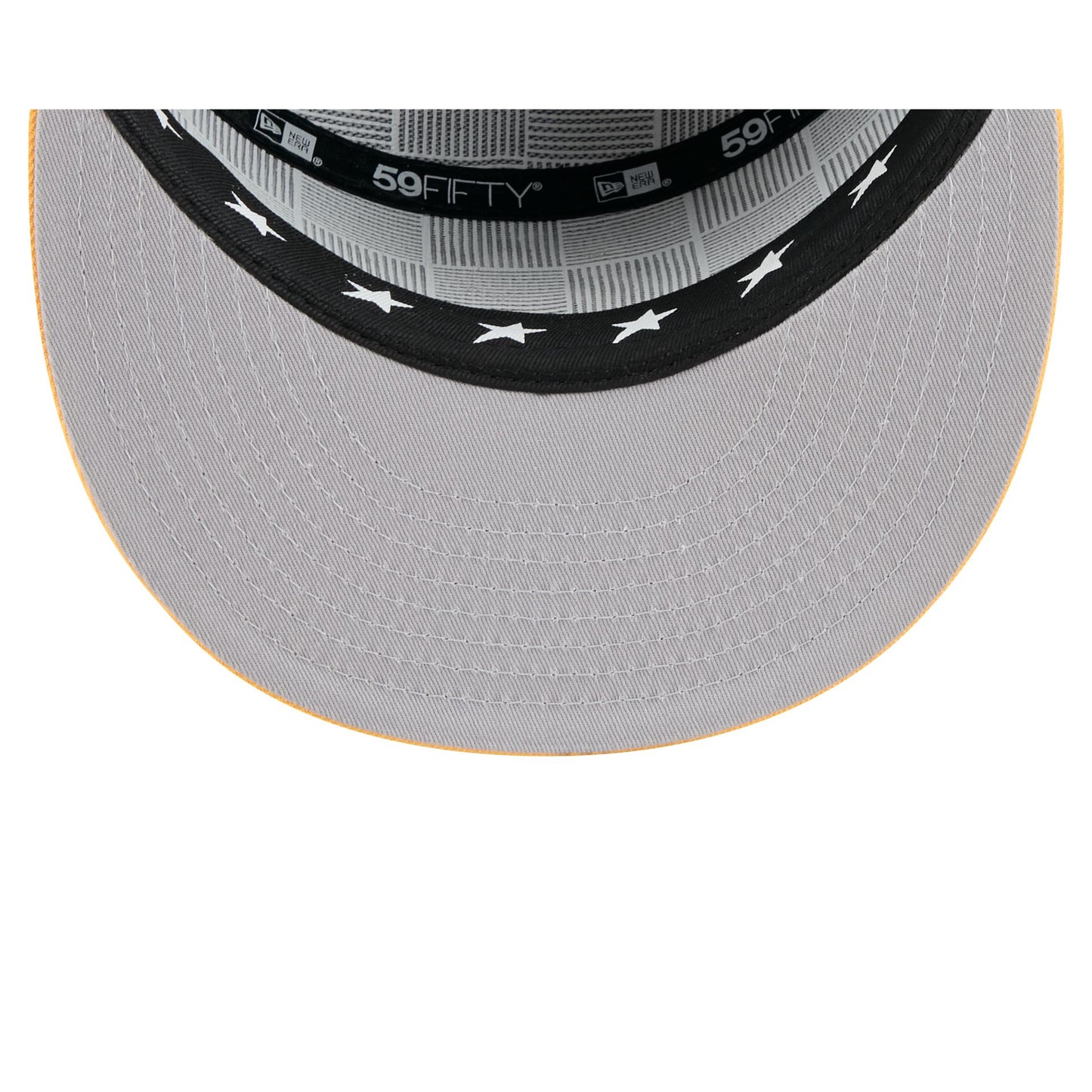 The Pittsburgh Pirates 2025 All-Star Game Split Panel 59FIFTY Fitted Cap features an embroidered Pirates logo at the front panels against a split-crown construction with breathable mesh fabric at the side and rear panels. Additional details include stars at the top panel, a 2025 All-Star Game patch at the right-wear side, the MLB Batterman logo at the rear, and a gray undervisor. The cap also features screen-printed stars on the sweatband.