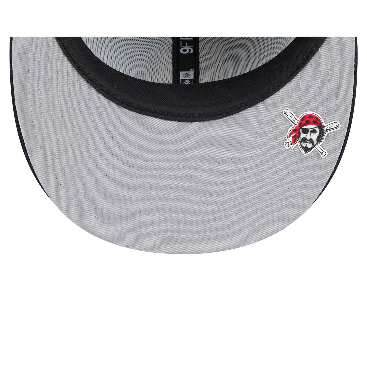 The Pittsburgh Pirates 2025 Clubhouse Alt 9FIFTY Snapback features an embroidered Pirates alternate logo at the front panels with a dashmark mesh fabrication throughout. Additional details include a snapback closure at the rear and a silicone logo on a gray undervisor.