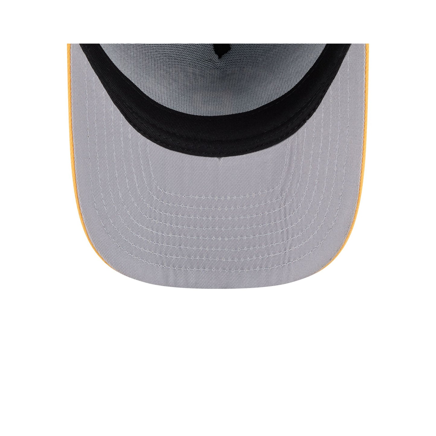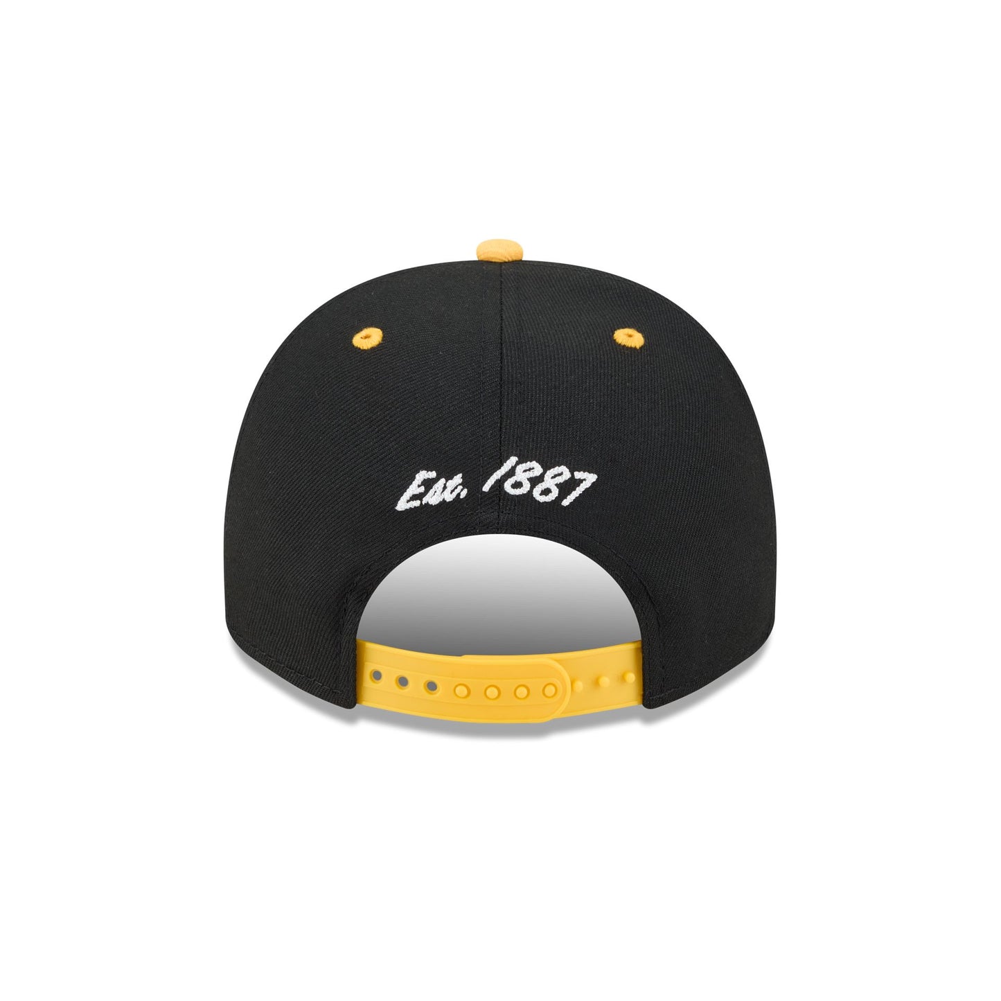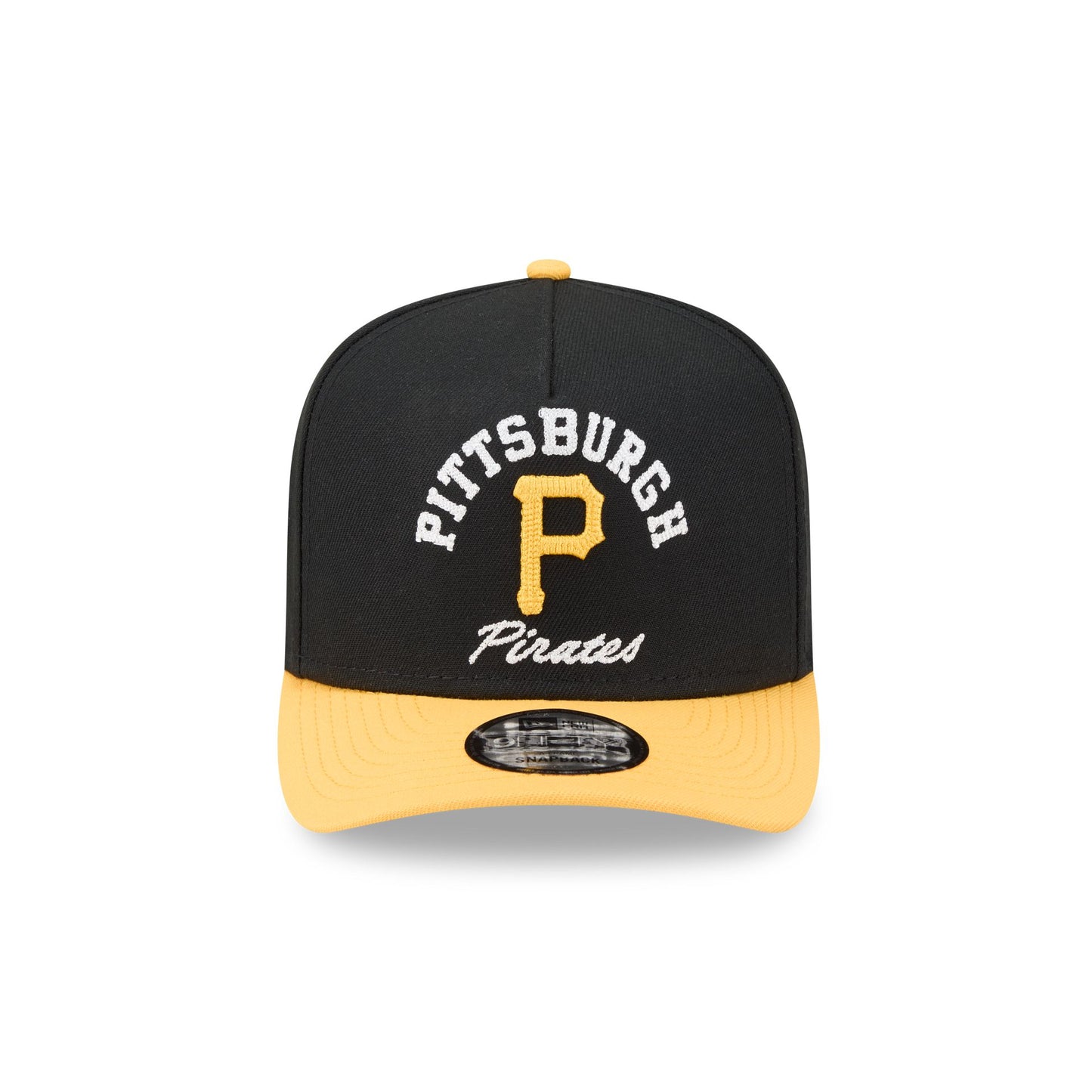 The Pittsburgh Pirates Arched 9FIFTY A-Frame Snapback features an embroidered Pirates arched graphic at the front panels with a team graphic at the right-wear side. Additional details include the establishment year above an adjustable snapback closure at the rear and a gray undervisor.