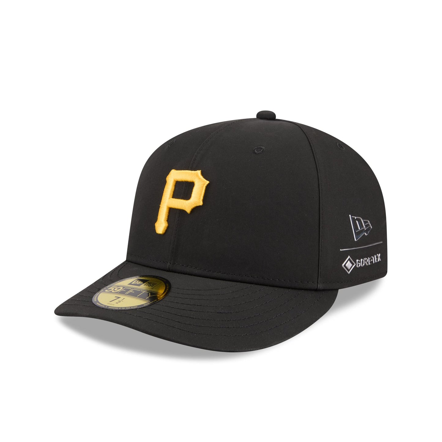 The Pittsburgh Pirates GORE-TEX 59FIFTY Fitted Cap features an embroidered Pirates logo at the front panels with a metallic sheen silicone New Era Flag logo and GORE-TEX logo at the left-wear side. Additional details include the MLB Batterman logo at the rear, a gray undervisor, and a polyester fabrication throughout the cap. It is waterproof, breathable, and lightweight. This 59FIFTY comes with a pre-curved visor.