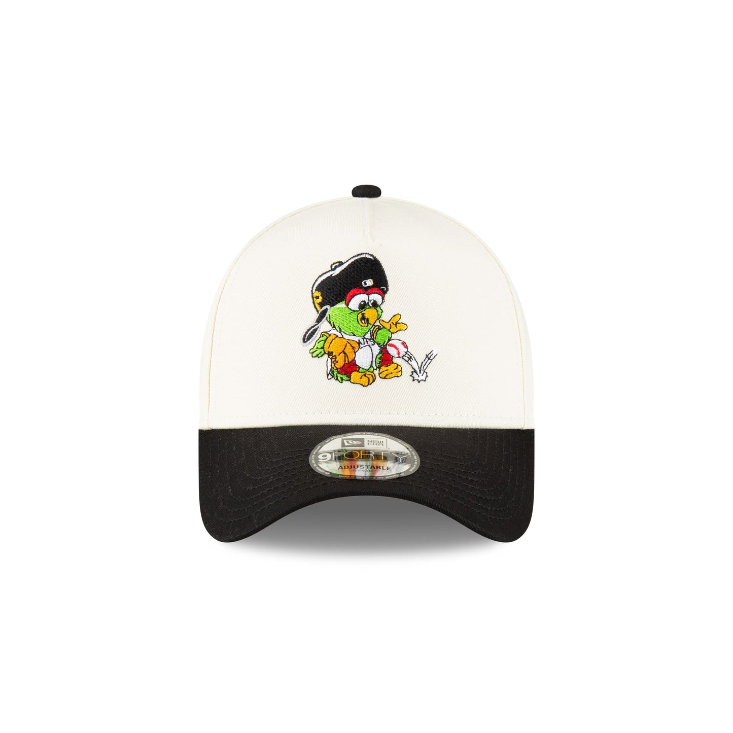 The Pittsburgh Pirates Mini Mascot 9FORTY A-Frame Snapback features an embroidered Pirates mascot at the front panels with a PNC Park patch at the right-wear side and a snapback closure at the rear.