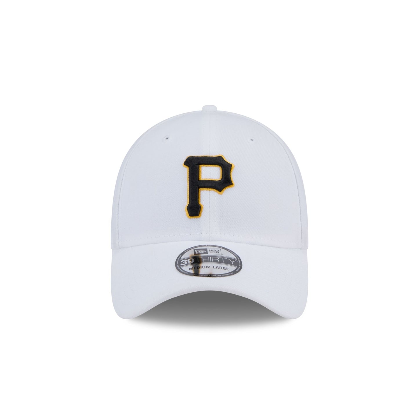 The Pittsburgh Pirates Optic White 39THIRTY Stretch Fit Hat features an embroidered Pirates logo at the front panels with a matching team wordmark at the rear and a white undervisor.
