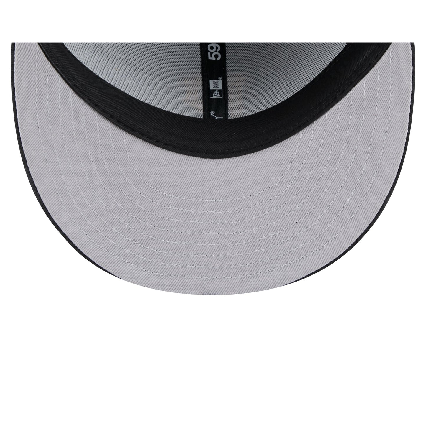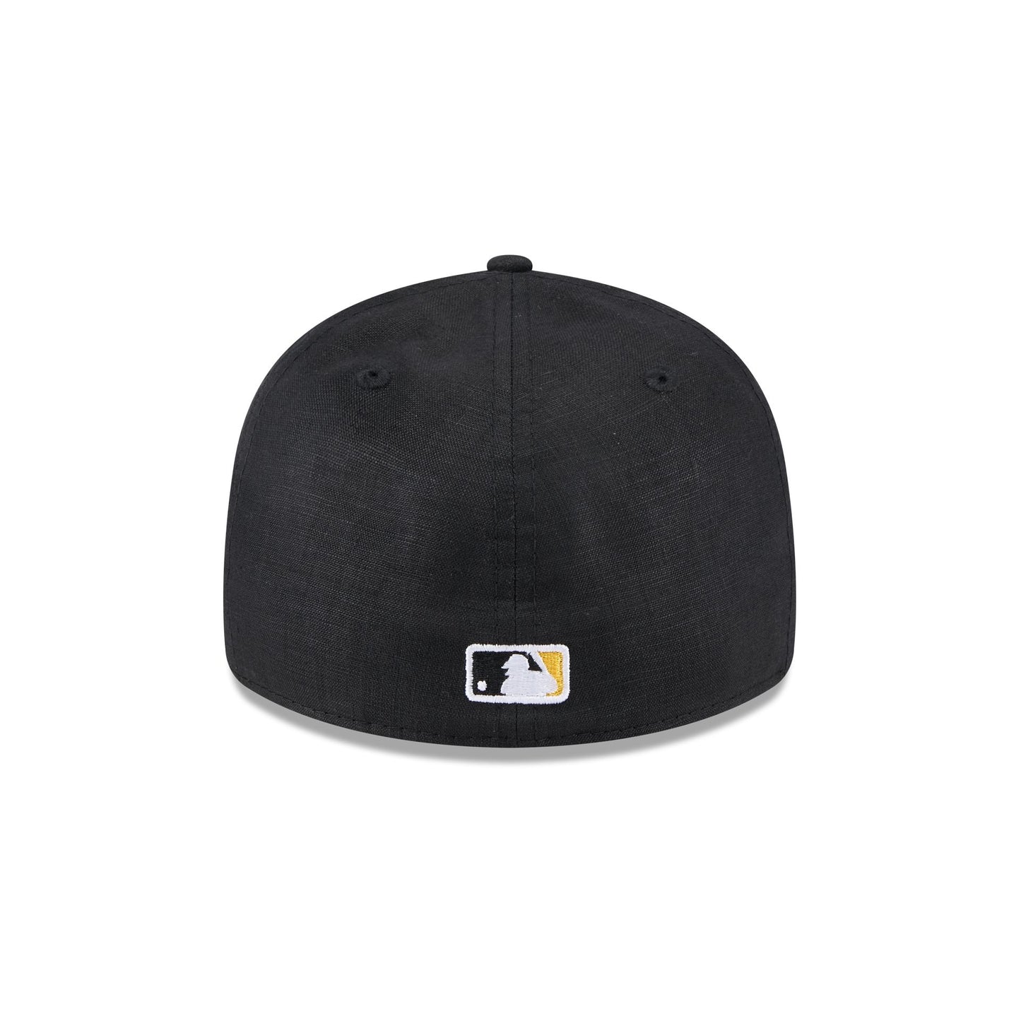 The Pittsburgh Pirates Snake Scale Logo Low Profile 59FIFTY Fitted Cap features an embroidered Pirates snake-stitch logo at the front panels with a matching MLB Batterman logo at the rear and a gray undervisor.