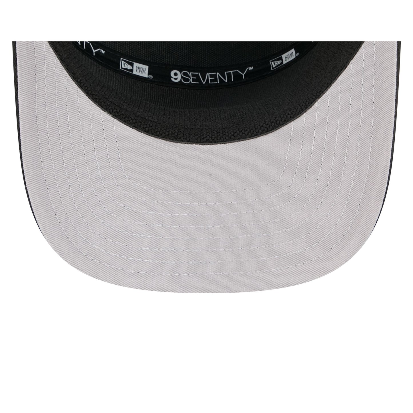 The Pittsburgh Pirates Split Panel 9SEVENTY Stretch-Snap features an embroidered Pirates logo at the front panel with a split crown construction and a rope at the visor. Additional details include an adjustable stretch-snap closure at the rear and a gray undervisor.