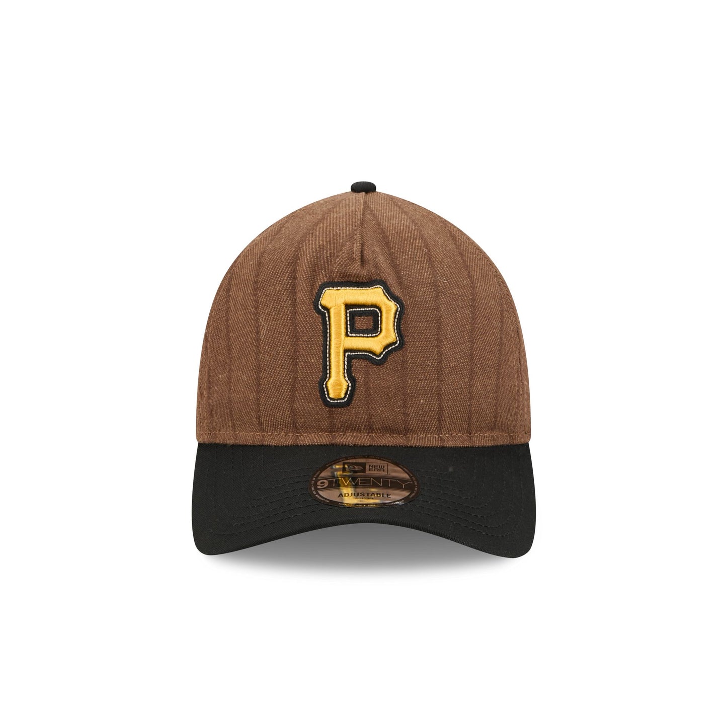 The Pittsburgh Pirates Three Looms Wool Pinstripe 9TWENTY Adjustable Cap features an embroidered Pirates logo at the front panels with a matching MLB Batterman logo at the right-wear side, a green undervisor, and an adjustable buckle closure at the rear.