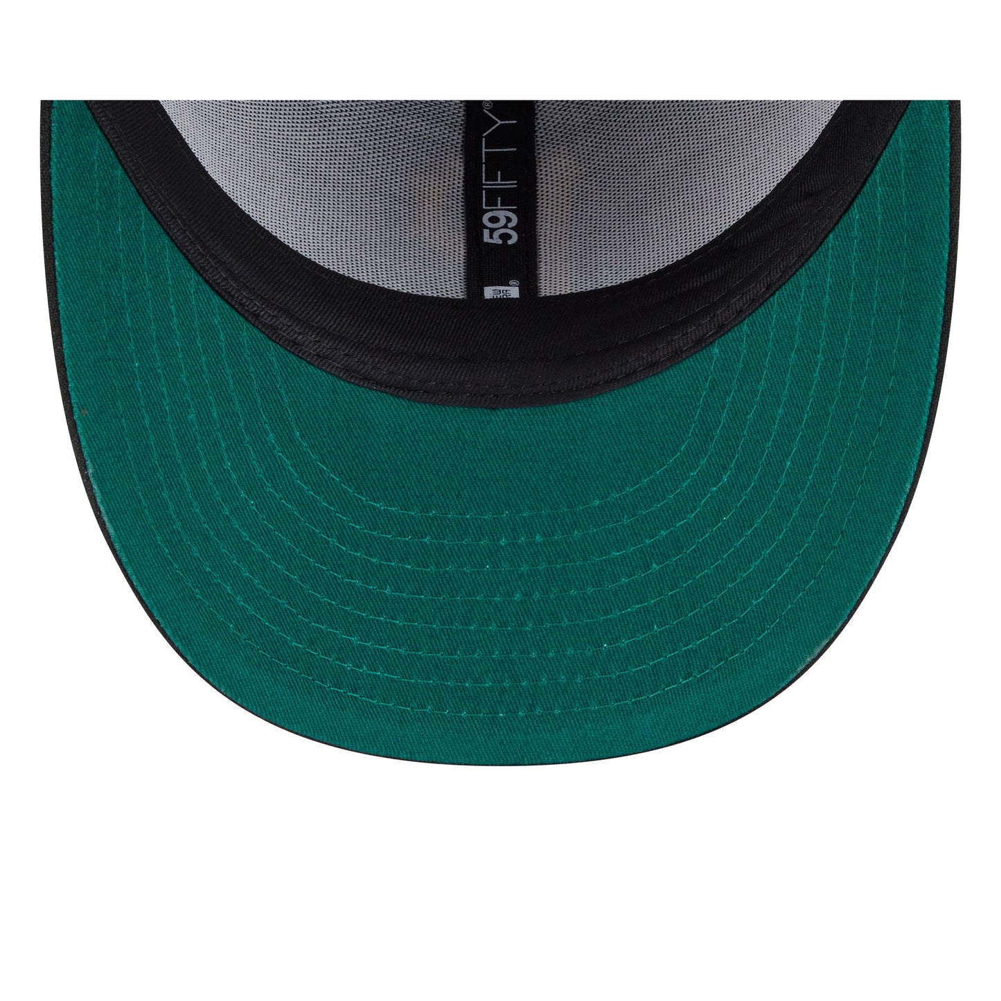 The Pittsburgh Pirates Tonal Florals Black Pre-Curved 59FIFTY Fitted Cap features an embroidered Pirates logo at the front panels with a team color visor and a green undervisor. Additional details include chainstitched embroidered flowers with handstitched beading at the left-wear side and a matching MLB Batterman logo at the rear.