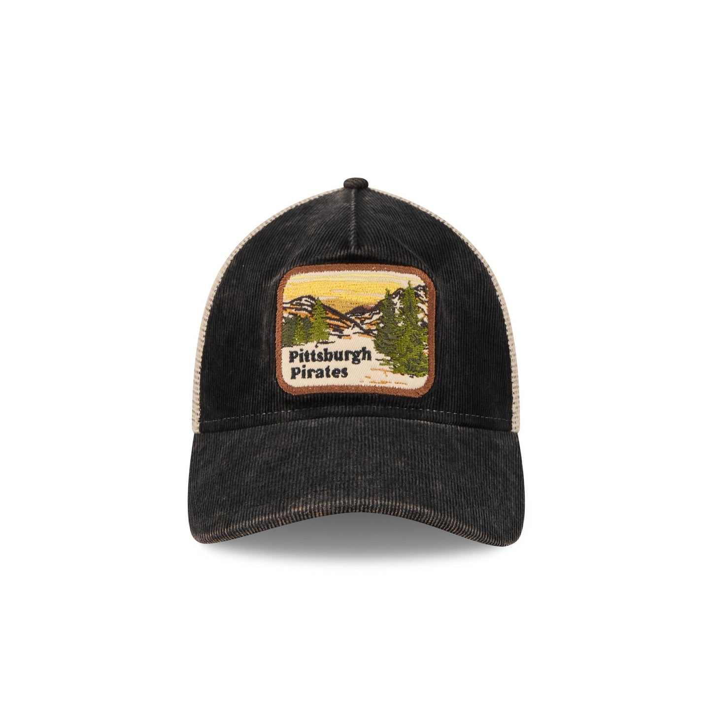 The Pittsburgh Pirates Vintage Landscape 9TWENTY A-Frame Trucker features an embroidered Pirates Vintage Landscape patch at the front panels with a team logo at the right-wear side. Additional details include an adjustable snapback closure at the rear and a gray undervisor.