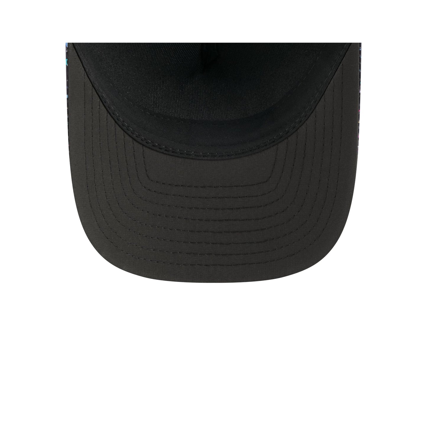 The Pittsburgh Steelers 2025 Crucial Catch 9FORTY M-Crown A-Frame Trucker features an embroidered Steelers logo at the front paint splatter panels with a woven NFL Shield tag above a snapback closure at the rear. Additional details include a Crucial Catch Intercept Cancer patch at the right-wear side with performance mesh rear panels and a black undervisor.