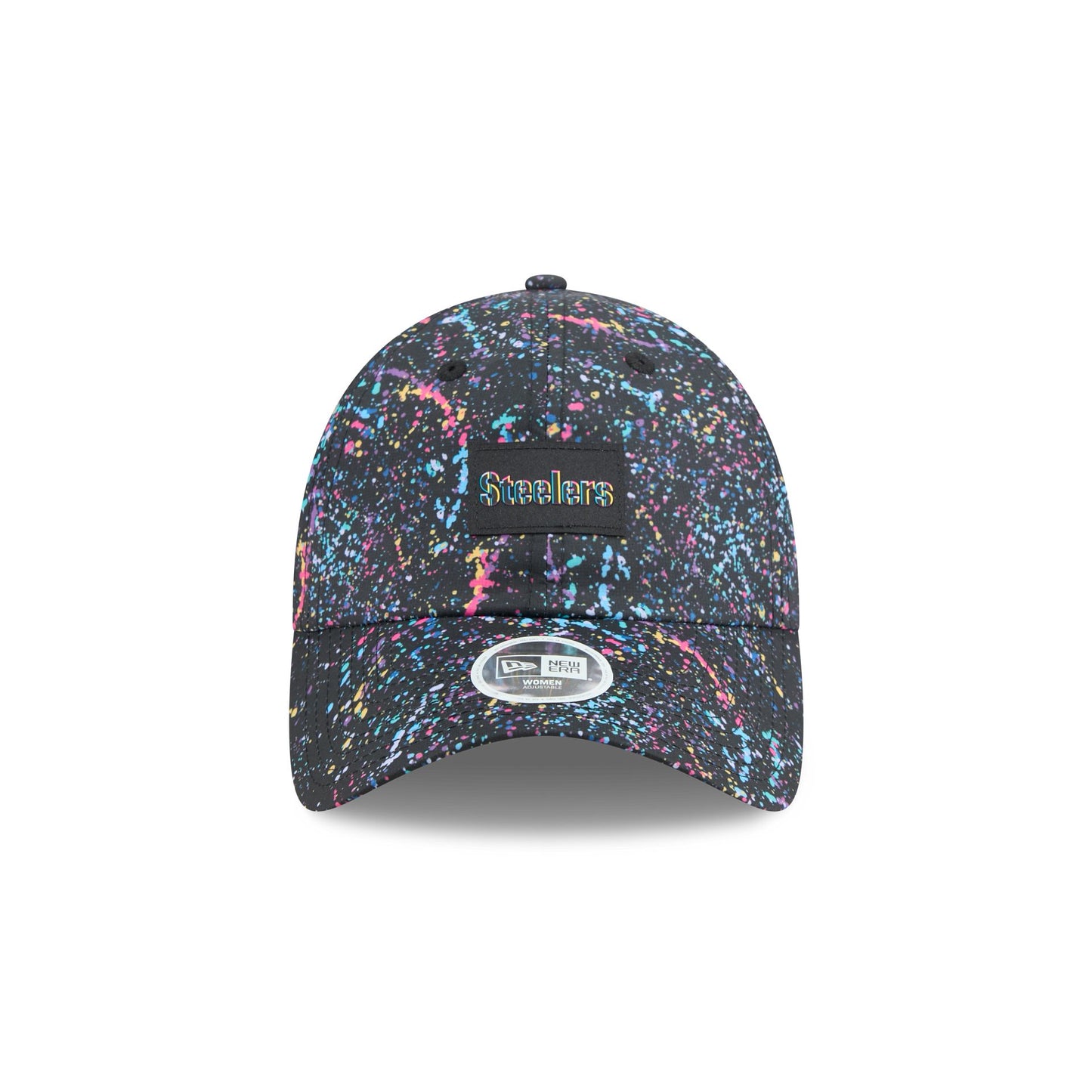 The Pittsburgh Steelers 2025 Crucial Catch Women's Open Back Ponytail Cap features a woven Steelers logo at the front paint splatter panels with a Crucial Catch Intercept Cancer patch at the right-wear side and a black undervisor. Additional details include a woven NFL Shield tag at the rear with an adjustable strap and open back panel to accommodate any hairstyle.