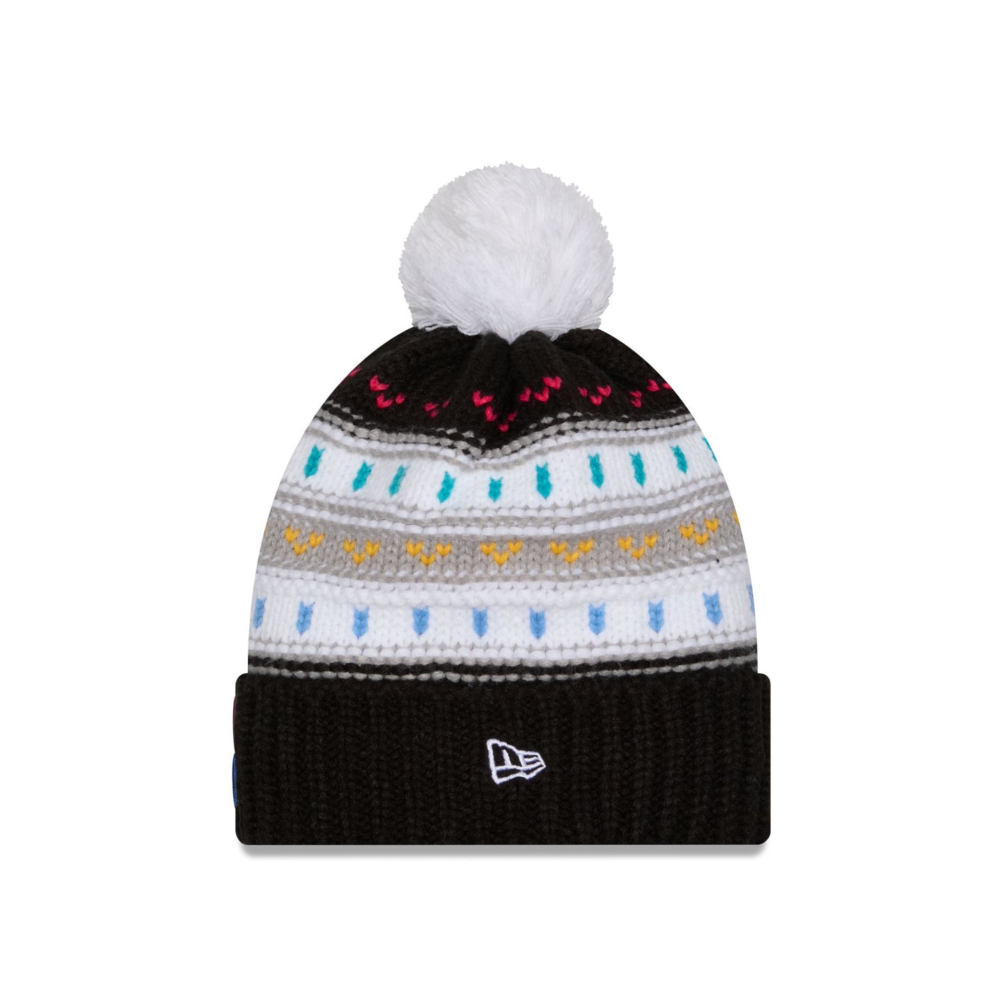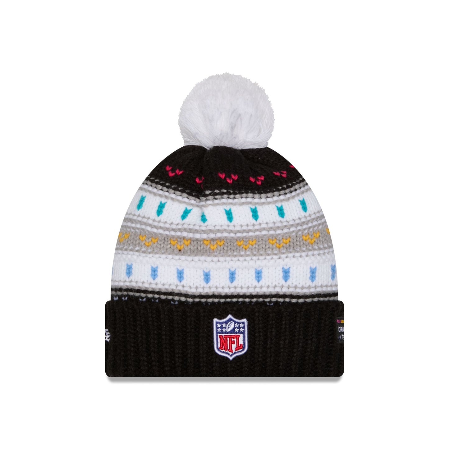 The Pittsburgh Steelers 2025 Crucial Catch Women's Pom Knit features an embroidered Steelers logo at the front with an NFL Shield at the rear, a Crucial Catch Intercept Cancer patch at the right-wear side, and a one-time removeable pom.