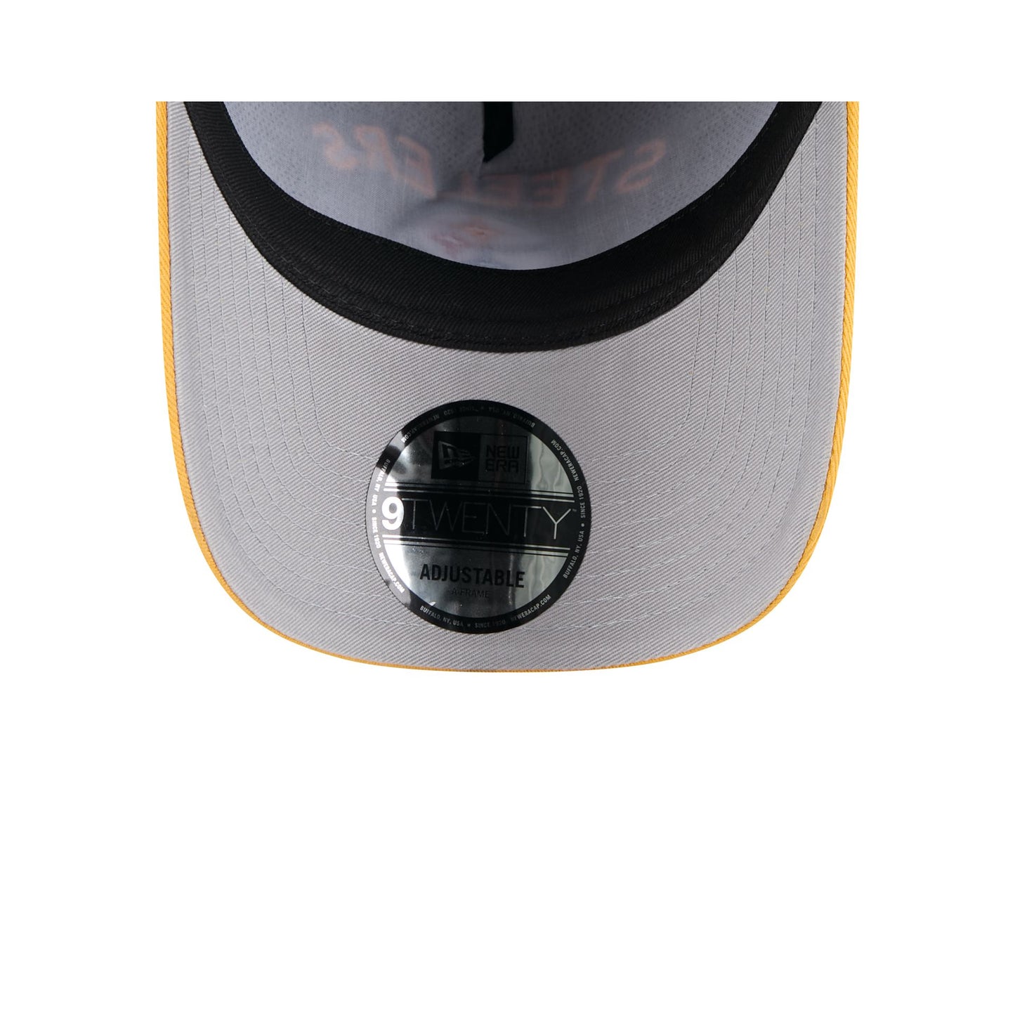 The Pittsburgh Steelers 2025 Draft 9TWENTY A-Frame Adjustable Cap features an embroidered Steelers logo and wordmark at the front panels with an NFL Shield logo above an adjustable D-Ring closure at the rear. Additional details include ornamental stitched details at the visor and a gray undervisor.