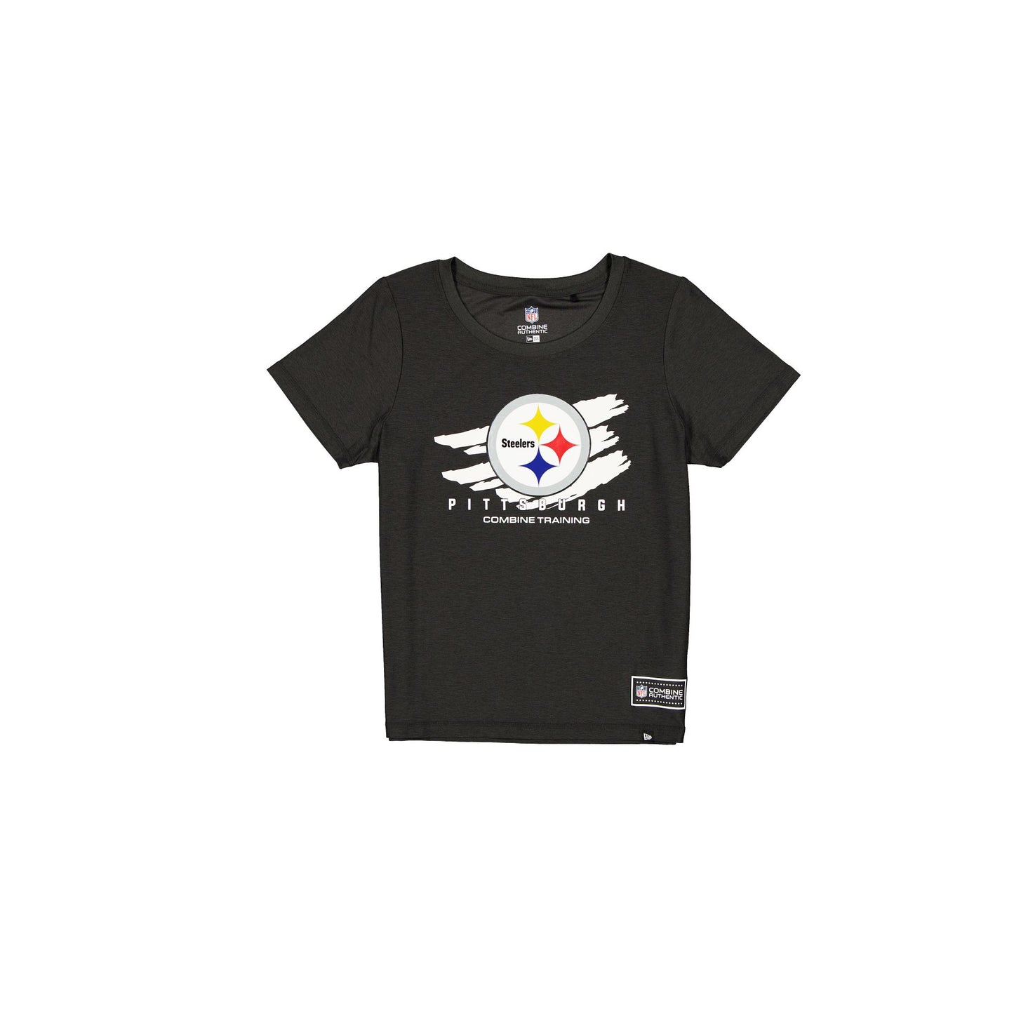 The Pittsburgh Steelers 2025 Functional Fandom Women's Short Sleeve T-Shirt features a clear gel UV ink Steelers brushstroke logo at the front with an Official NFL Combine Authentic patch at the left hip. Additional details include moisture-wicking and antimicrobial fabric with UV protection.