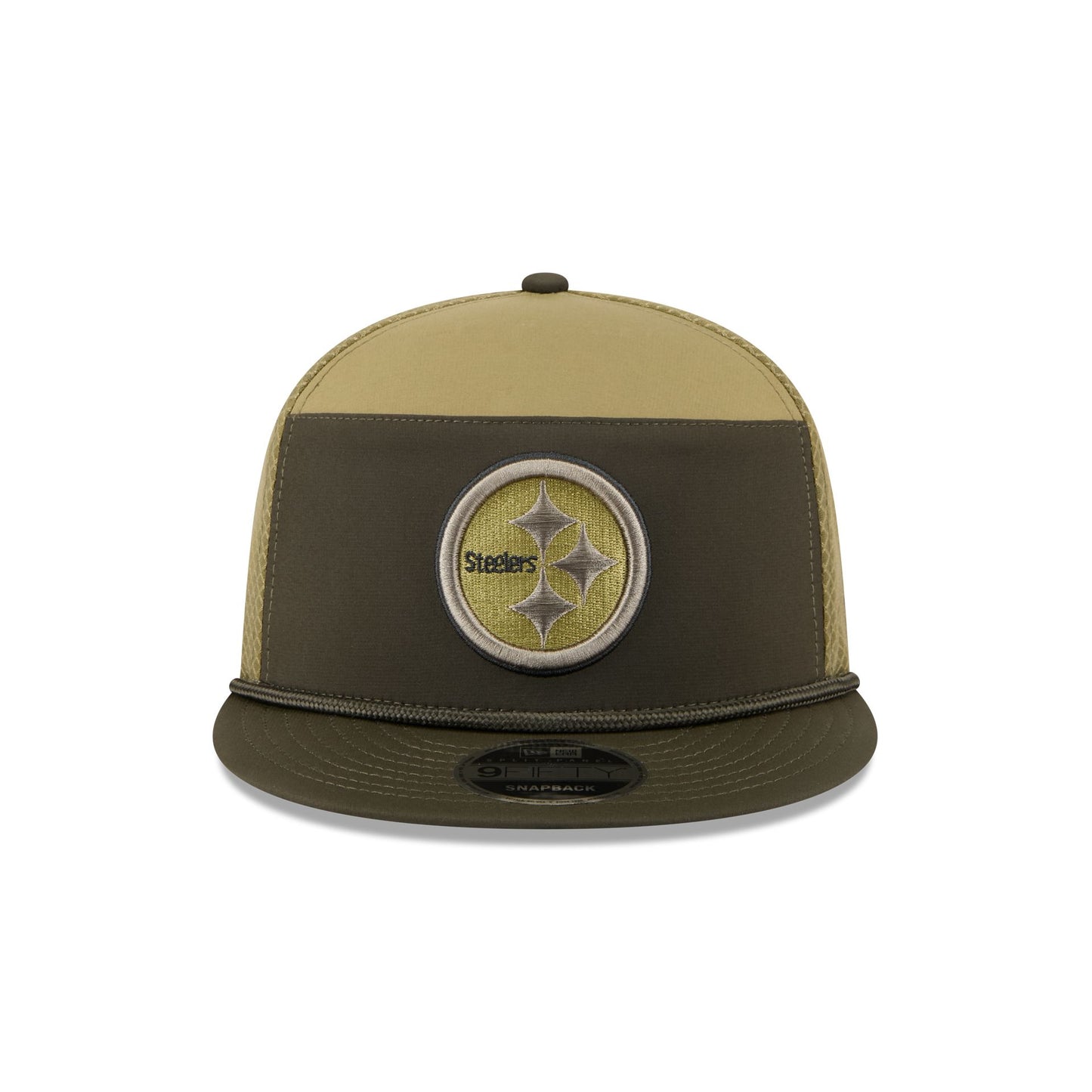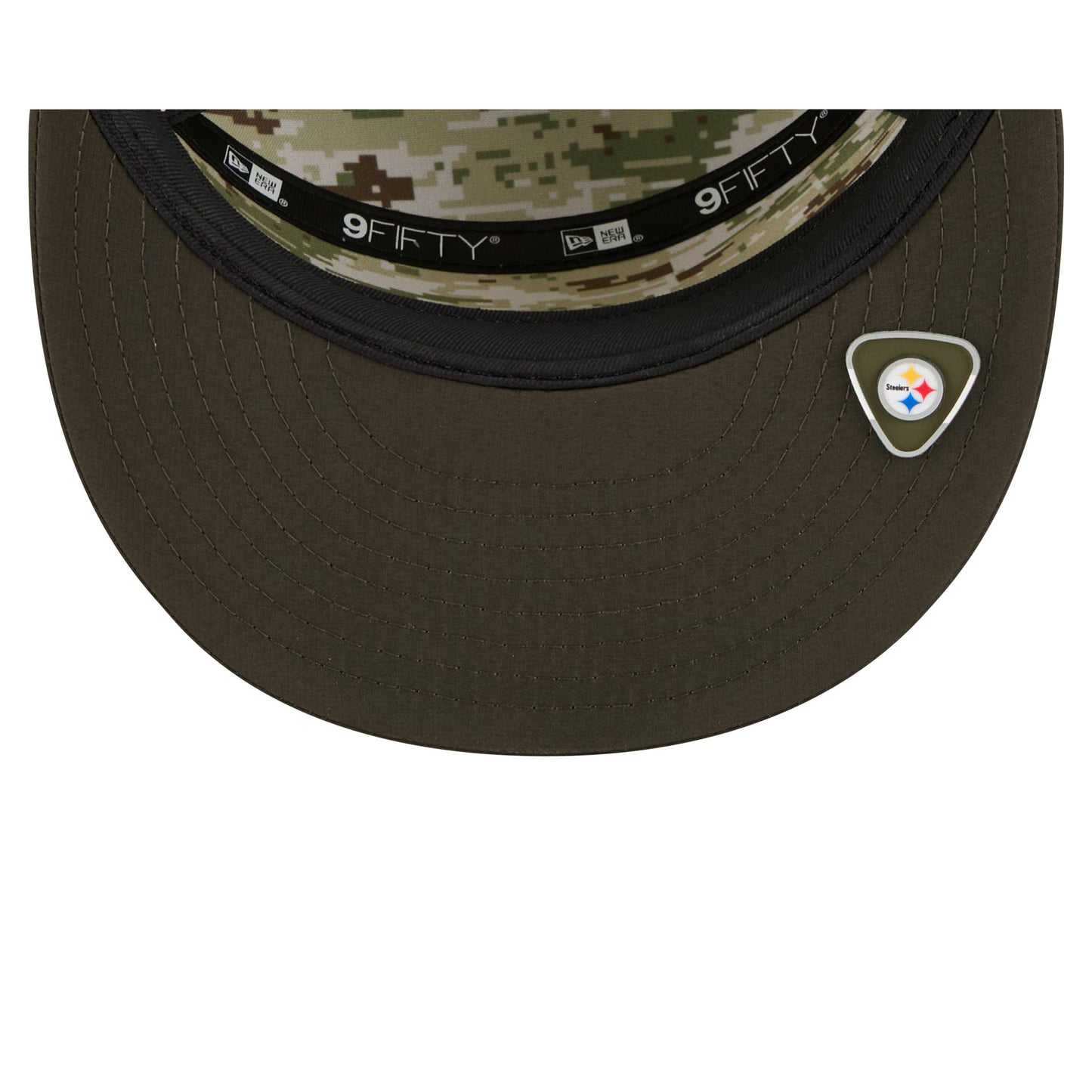 The Pittsburgh Steelers 2025 Salute to Service Split Panel 9FIFTY Trucker features an embroidered Steelers logo at the front panels with the official NFL Salute to Service patch above a snapback closure at the rear. Additional details include an American flag patch at the right-wear side with a silicone team logo patch at a dark green undervisor and a digi camo interior fabrication.