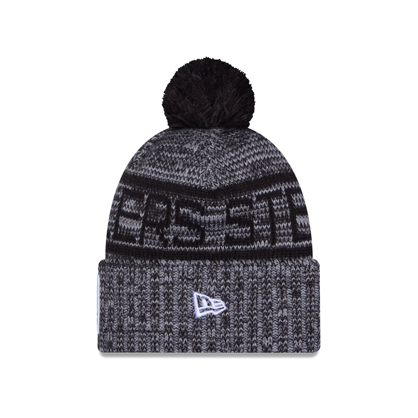 The Pittsburgh Steelers 2025 Sideline Cold Weather Gray Pom Knit Hat features a sewn-down silicone Steelers white logo patch at the front cuff with a matching Official NFL Shield logo at the rear. Additional details include a team wordmark across the crown, a one-time removeable pom, and a fleece lining.