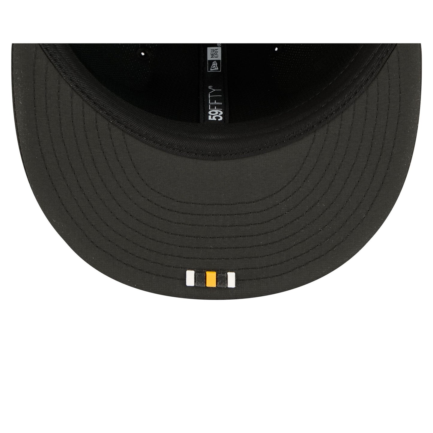 The Pittsburgh Steelers 2025 Sideline Hot Weather 59FIFTY Fitted Cap features a sewn-down silicone Steelers logo patch at the front panels with the Official NFL Shield logo at the rear. The cap has a water-repellent quill tech fabrication throughout, with a quick-dry cushioned sweatband to absorb moisture. The undervisor is accented with a silicone transfer in the team’s colors.