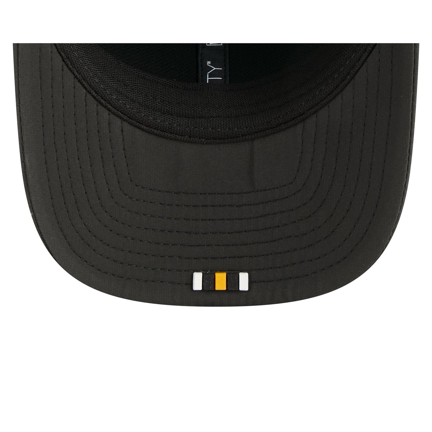 The Pittsburgh Steelers 2025 Sideline Hot Weather 9SEVENTY Trucker features a sewn-down silicone Steelers logo patch at the front panels with a water-repellent quill tech fabrication throughout and a quick-dry cushioned sweatband to absorb moisture. Additional details include the Official NFL Shield logo to the right of a soft silicone snapback closure at a light-weight mesh rear. The undervisor is accented with a silicone transfer in the team’s colors.
