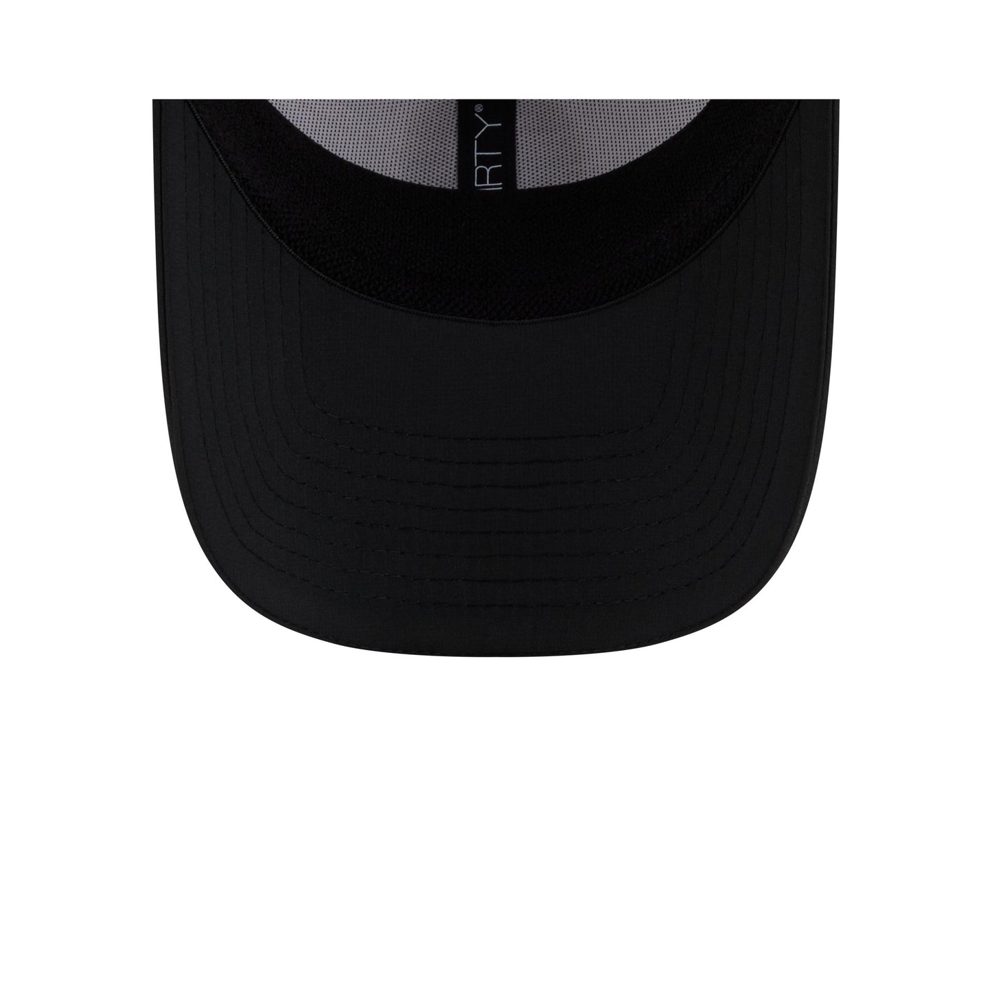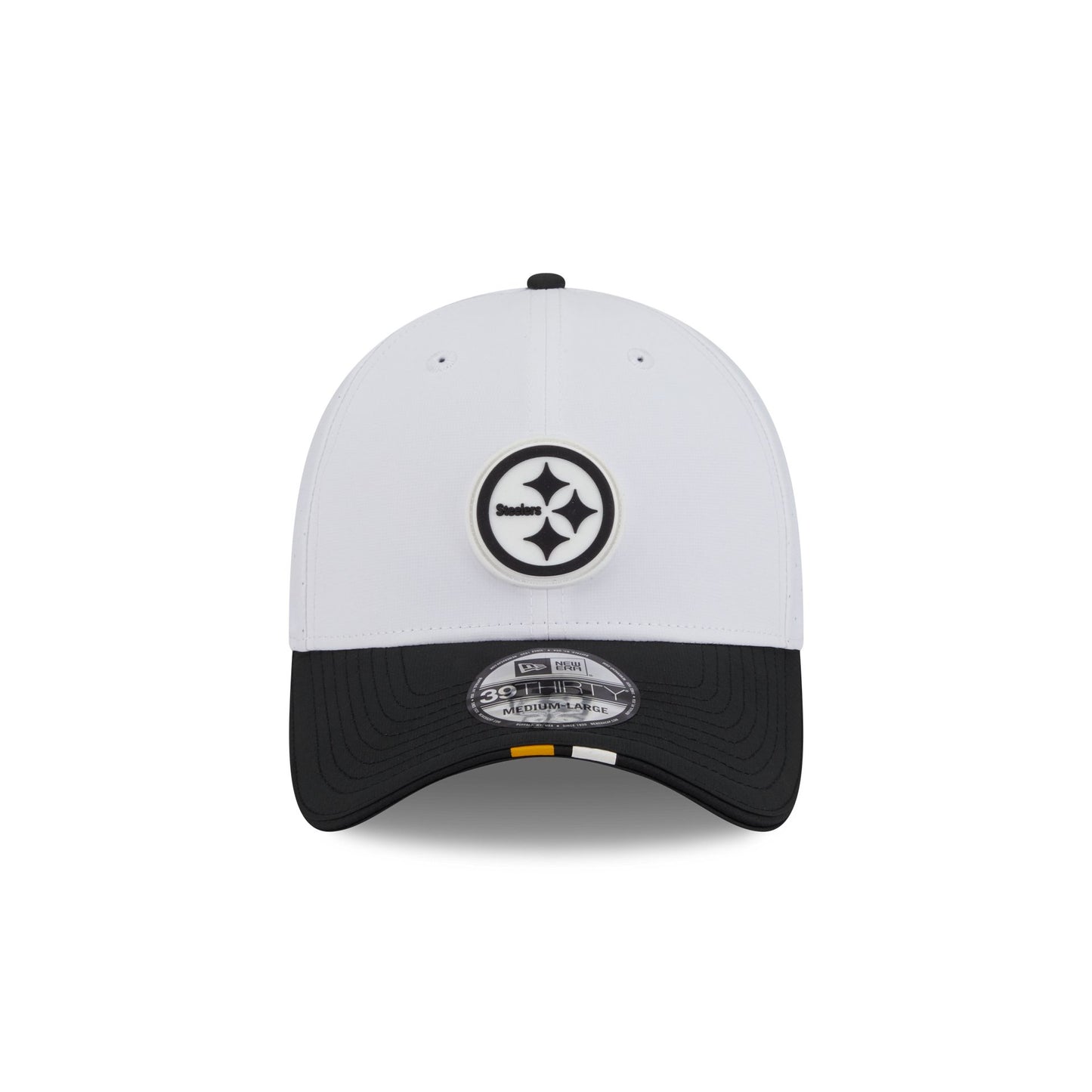The Pittsburgh Steelers 2025 Training 39THIRTY Stretch Fit Cap features a silicone Steelers patch at the front panels with team color stripes at the front of a black visor and a silicone NFL Shield patch at the rear.